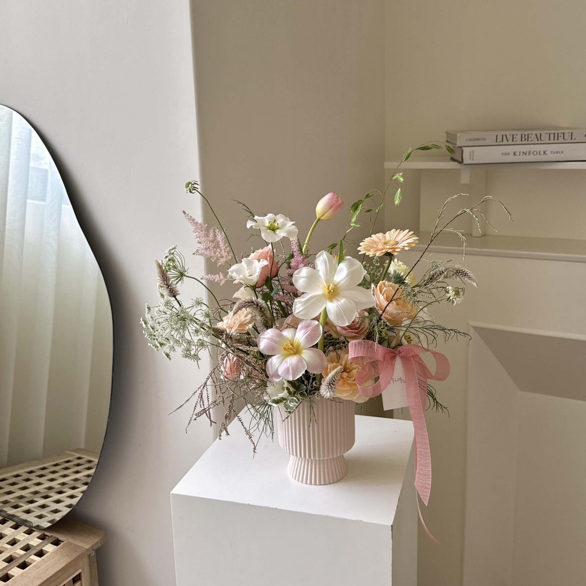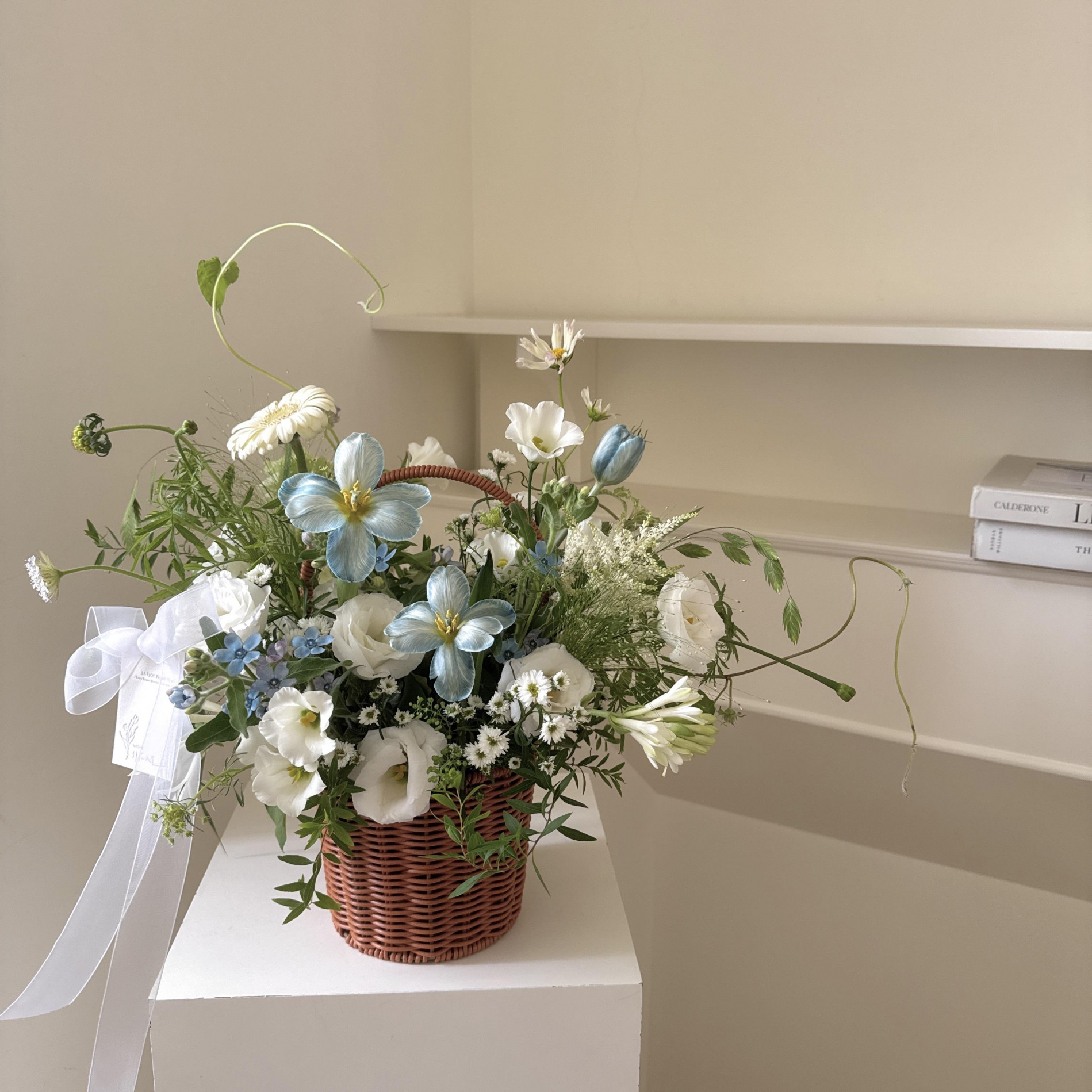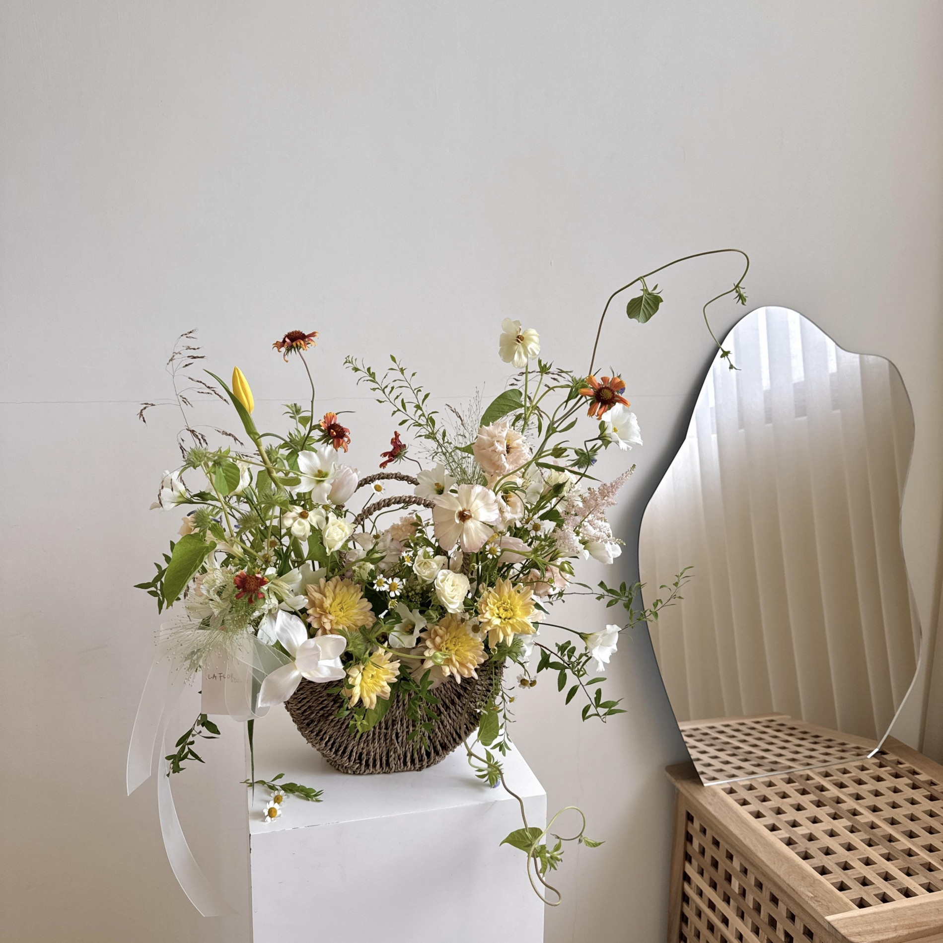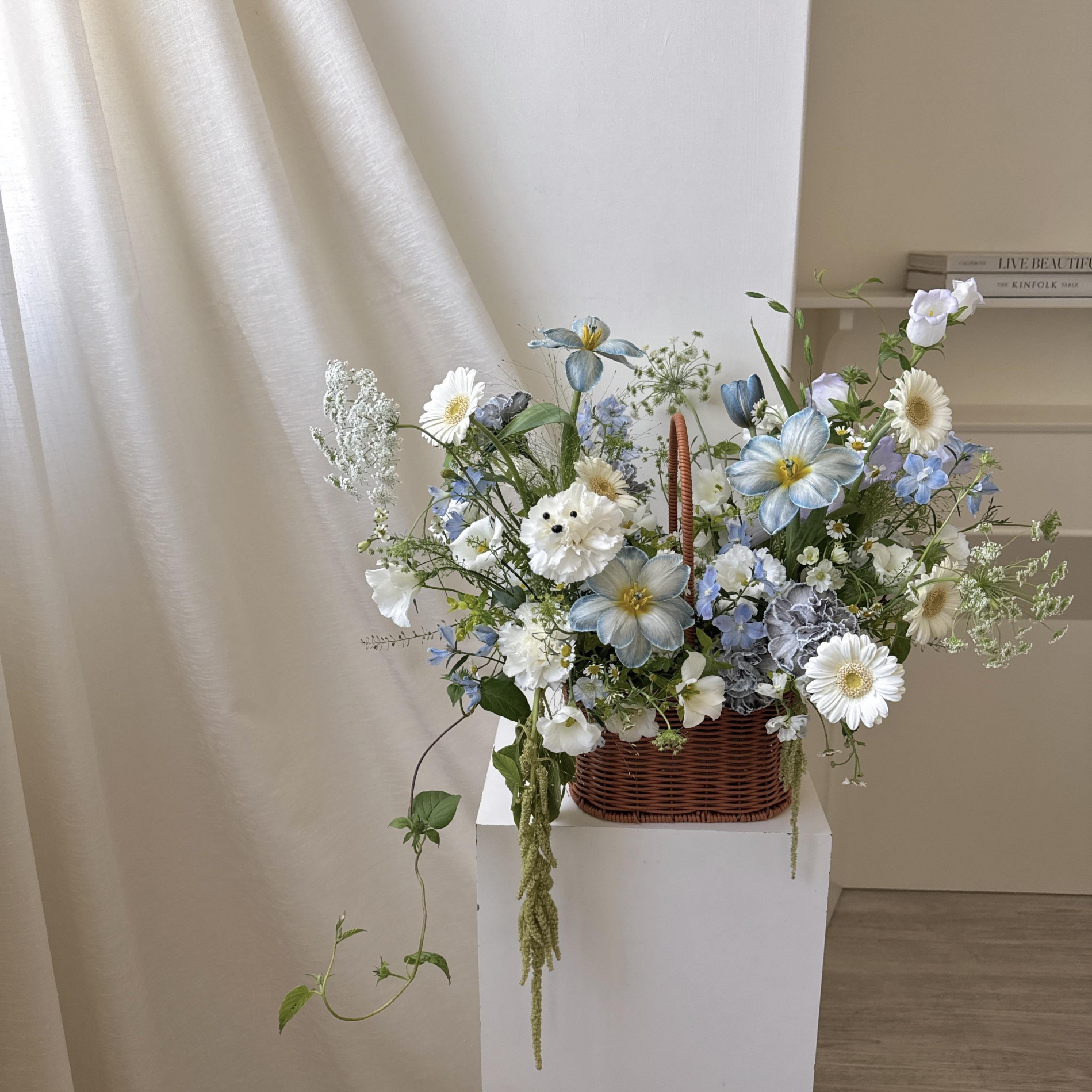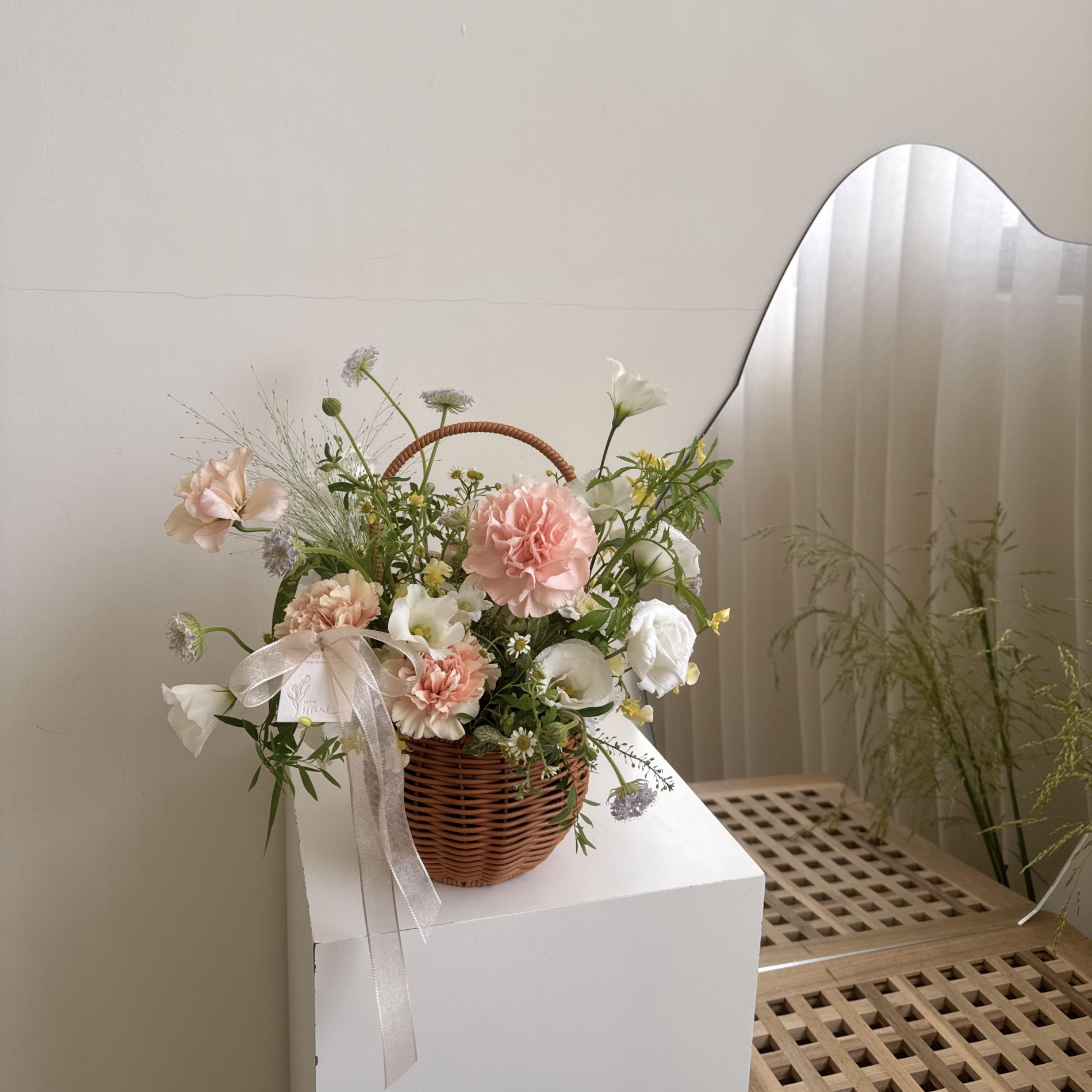 花籃配花與葉材皆依當季花材挑選設計,可挑色系,花材不會跟照片一樣唷!