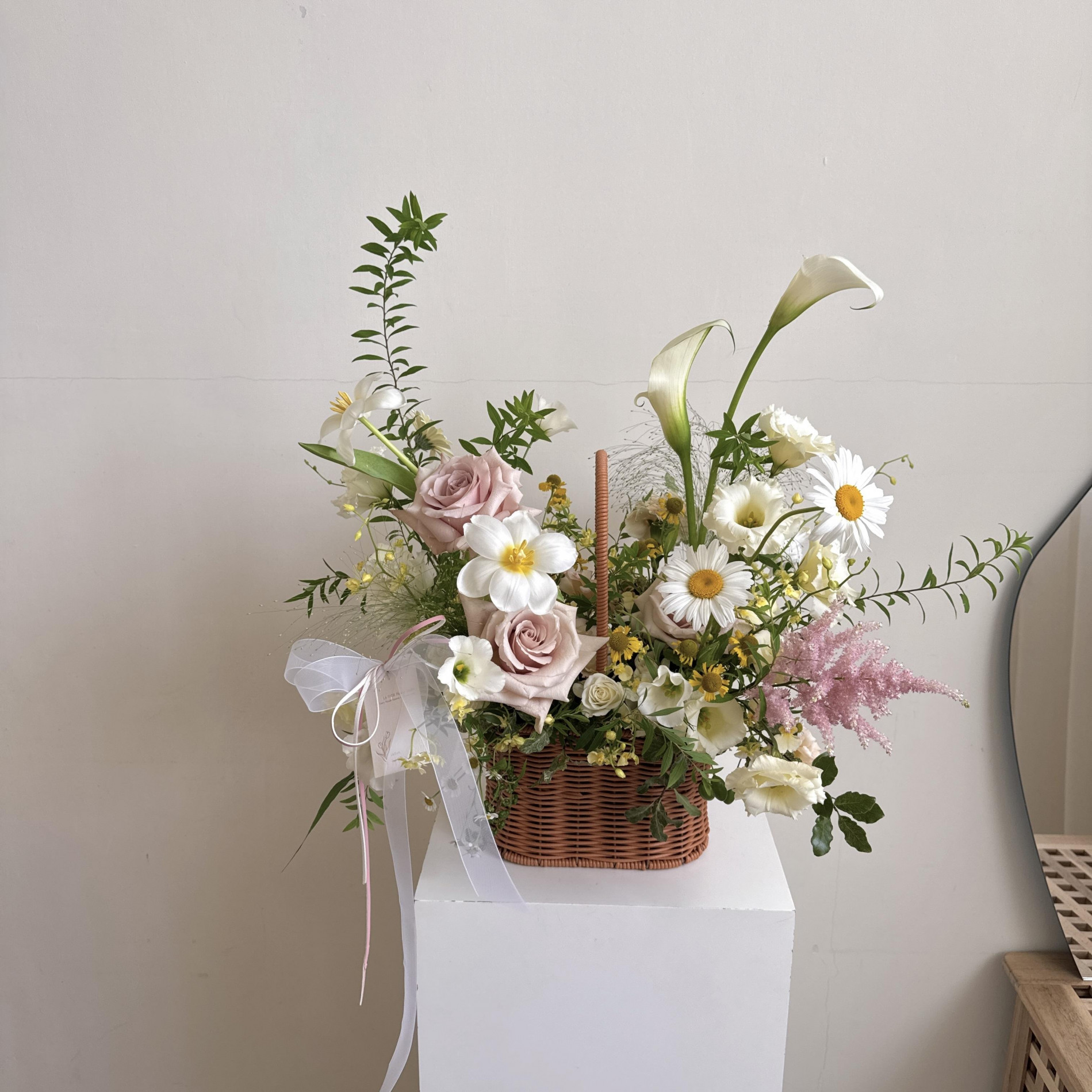 花籃配花與葉材皆依當季花材挑選設計,花材不會跟照片一樣唷!