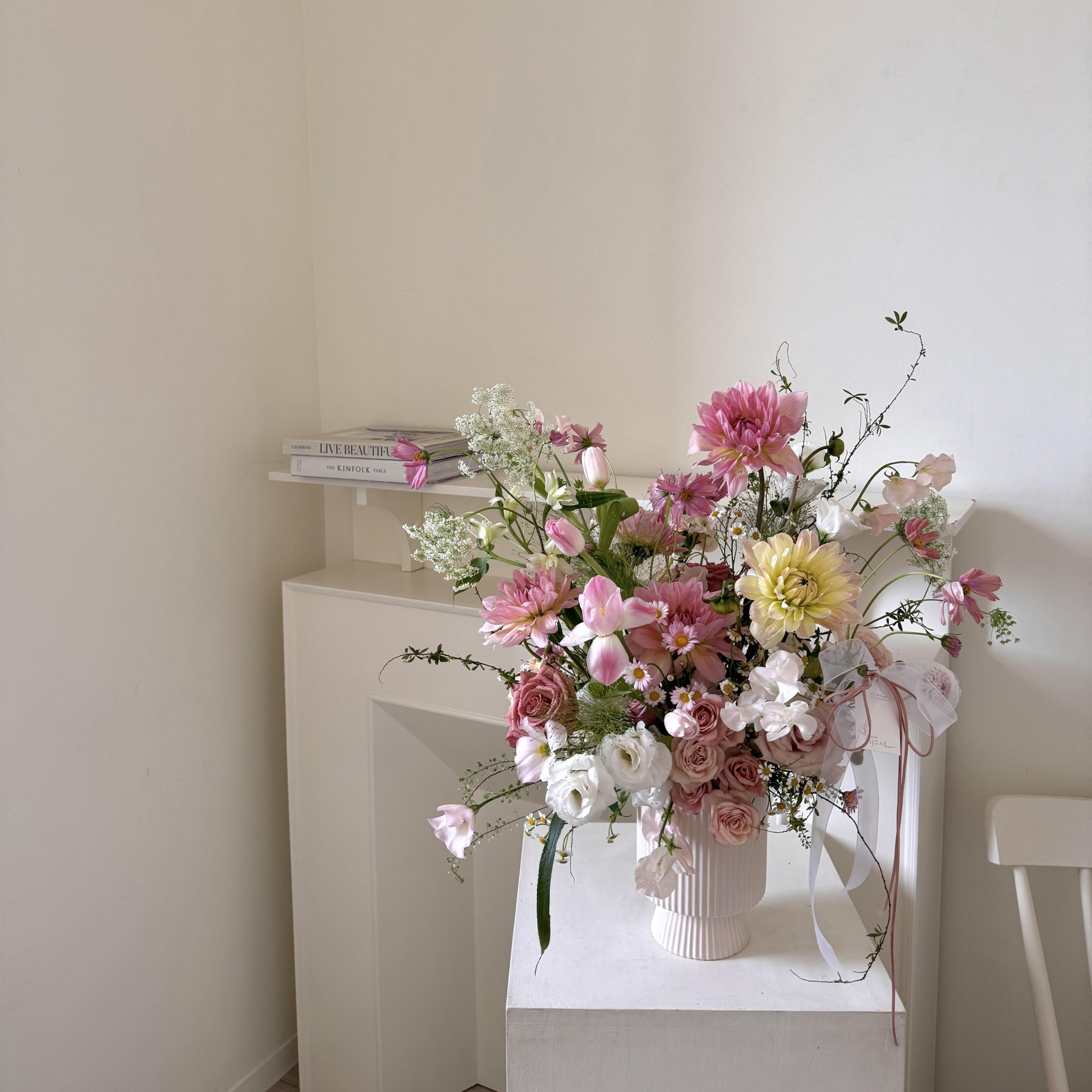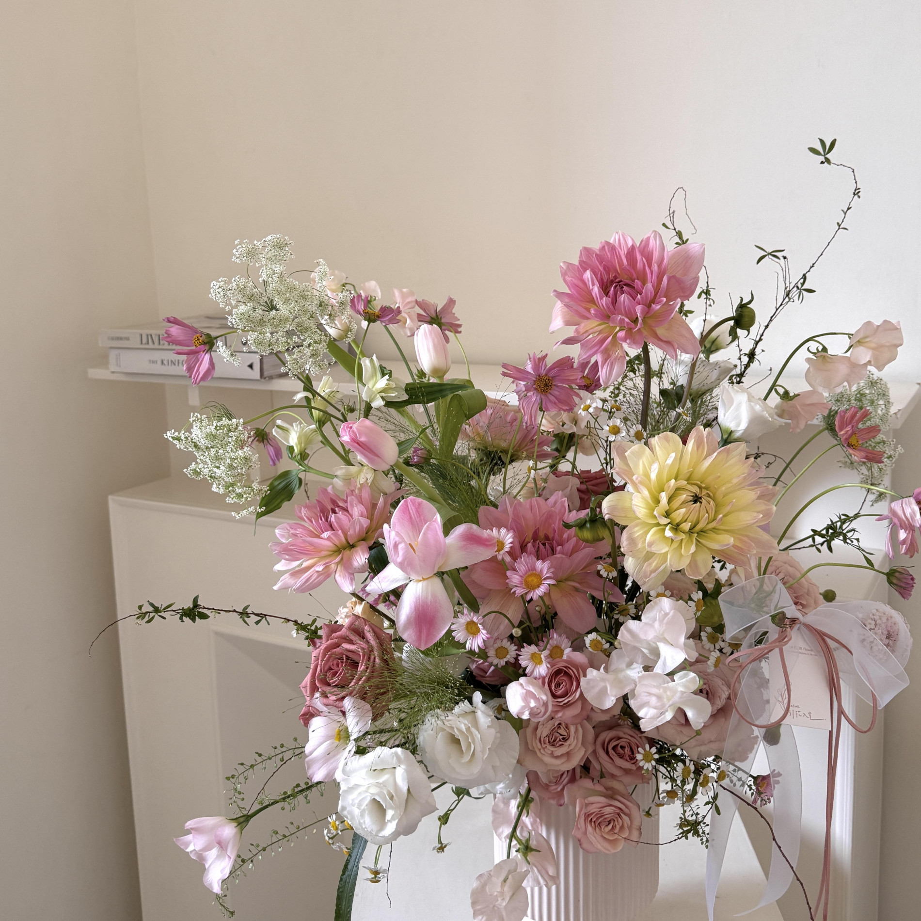 韓式風格大型桌花,花材皆挑選當季漂亮當季花材,適合開幕和新居送禮!