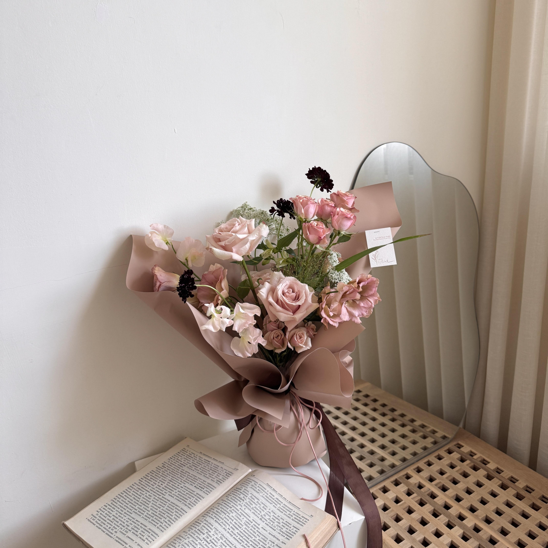 鮮花花材:3朵進口流沙玫瑰+多樣季節白粉色系配花