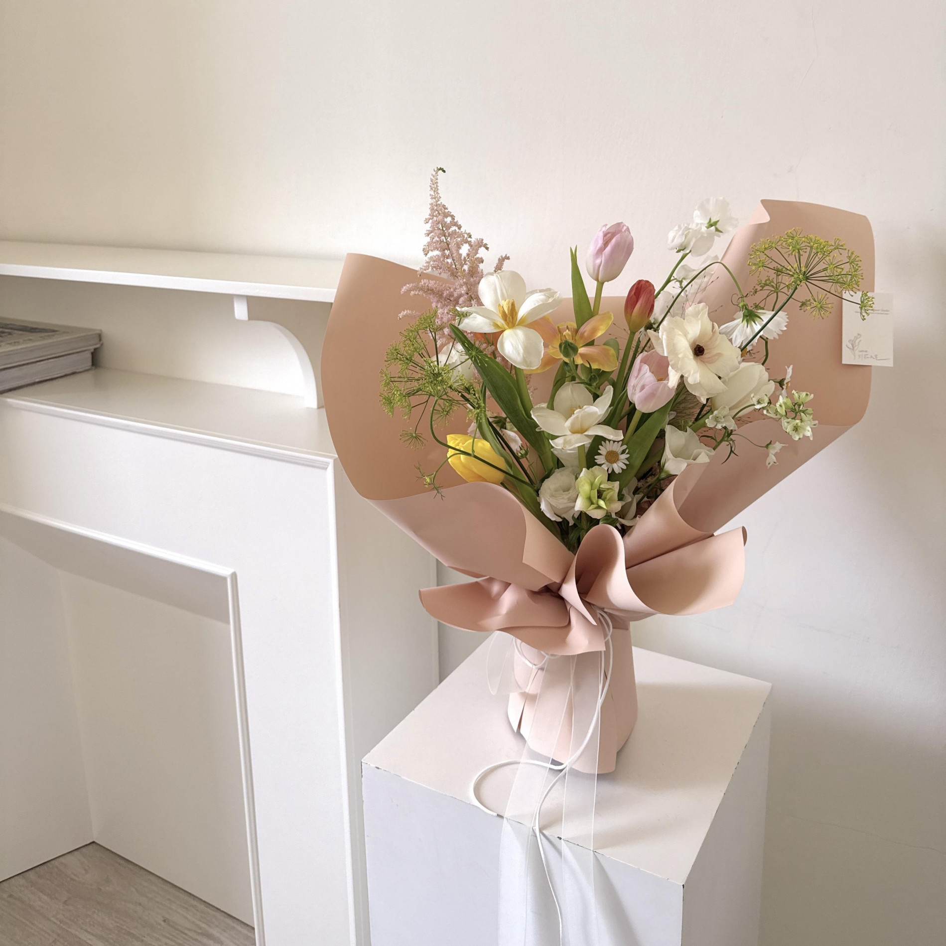 鬱金香進階花束-適合已熟悉螺旋花腳者,且想學習鬱金香搭配其他多樣不同特性之花材的設計,難度偏高