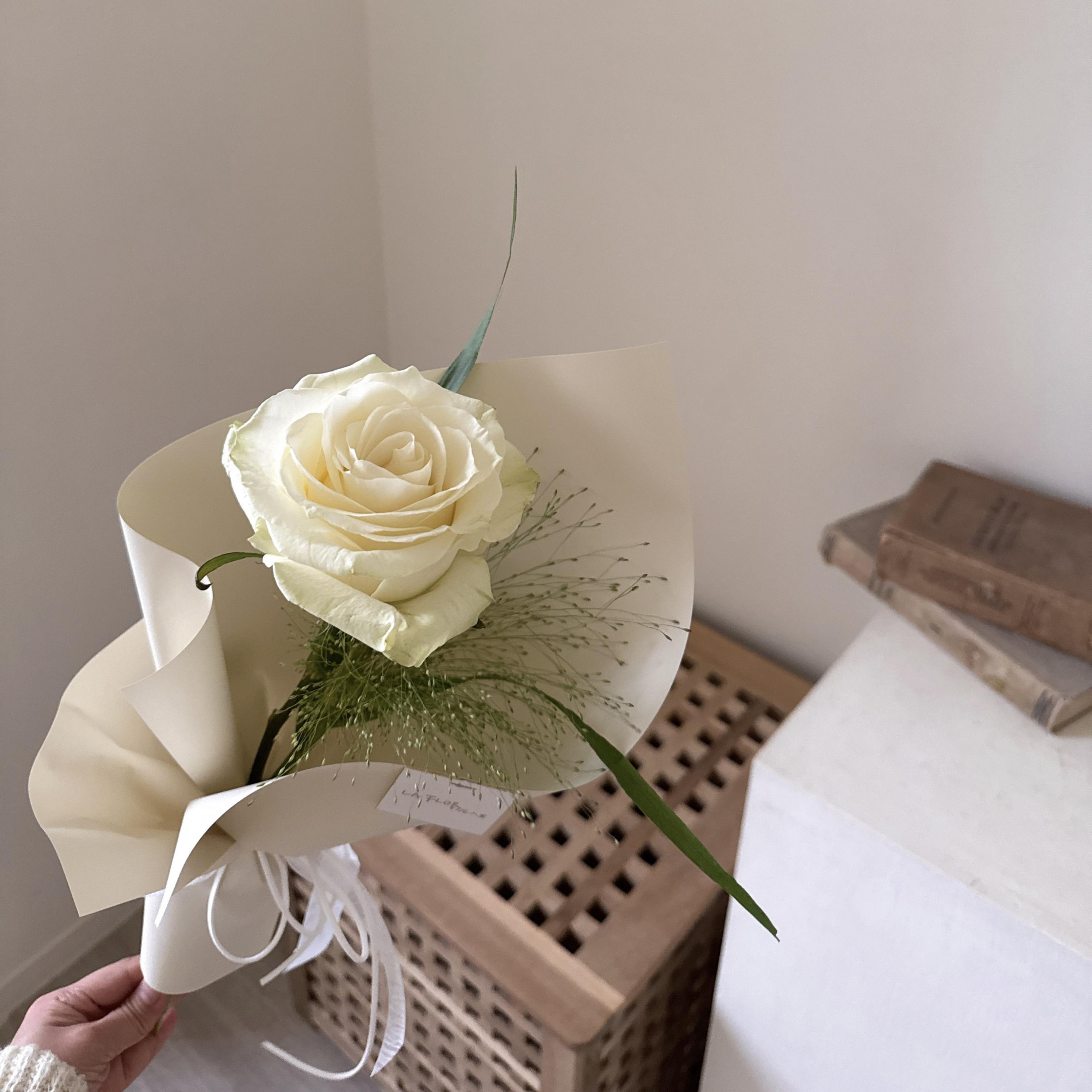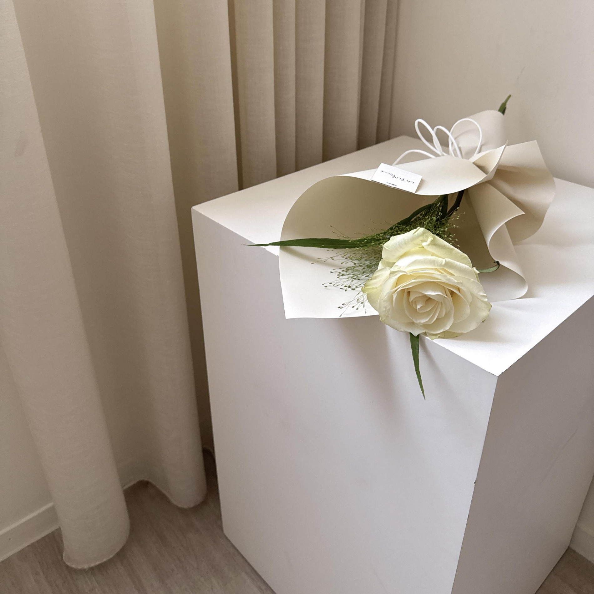 鮮花花材:進口白玫瑰1朵+1款季節花葉材