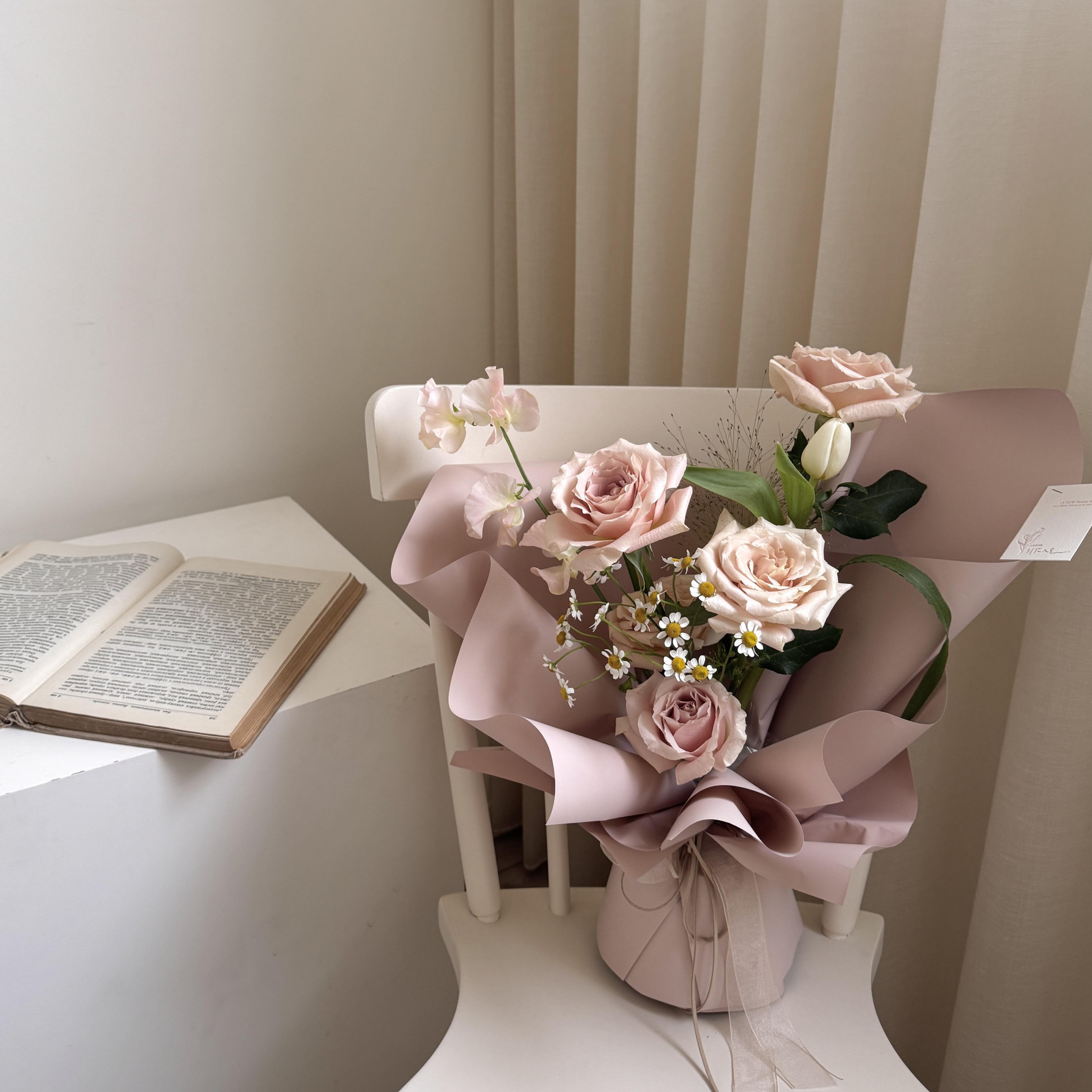鮮花花材:進口流沙玫瑰5朵+白色鬱金香1朵+3款季節葉材