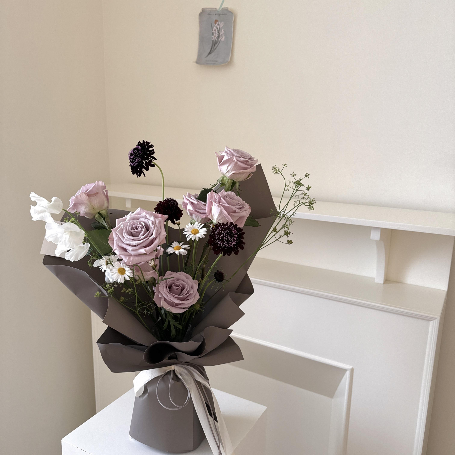 預訂如玫瑰當週缺貨將改用其他紫色系玫瑰替代。玫瑰以外的配花與葉材依當季花材設計,不一定跟照片一樣。