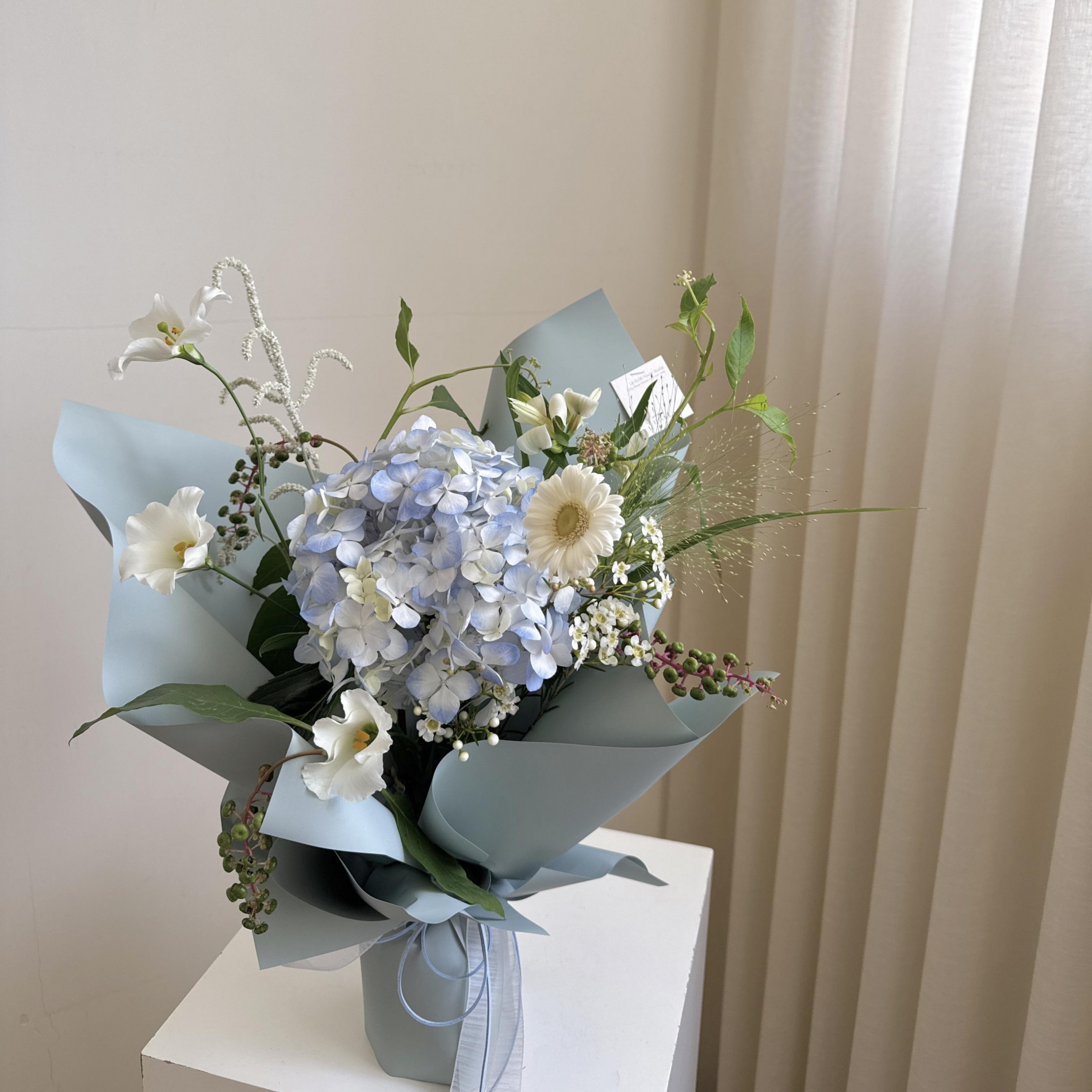 藍色繡球顏色深淺不一定跟照片一樣,將挑選當季漂亮的藍色繡球設計,配花依當季花材設計照片,不會跟照片一樣唷!