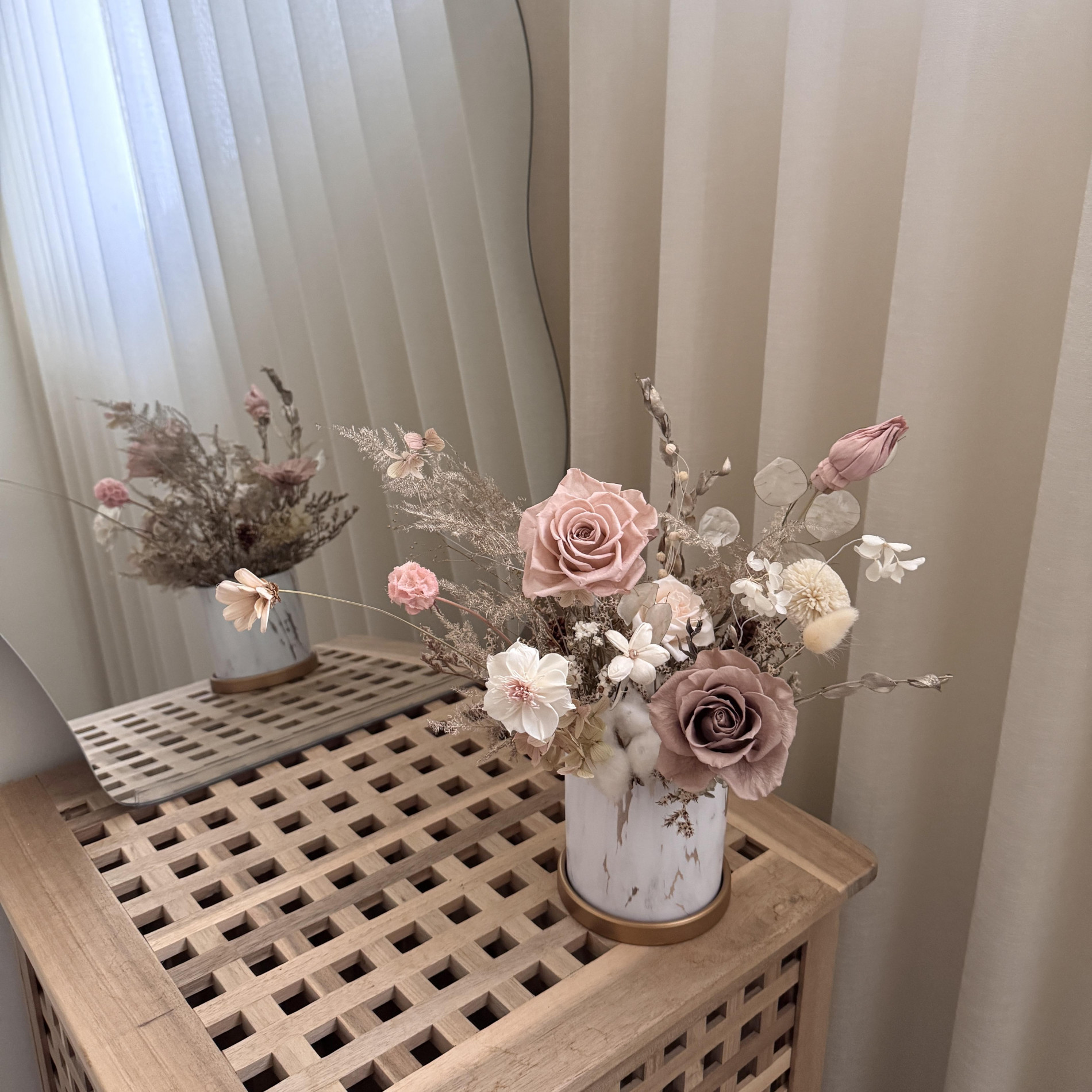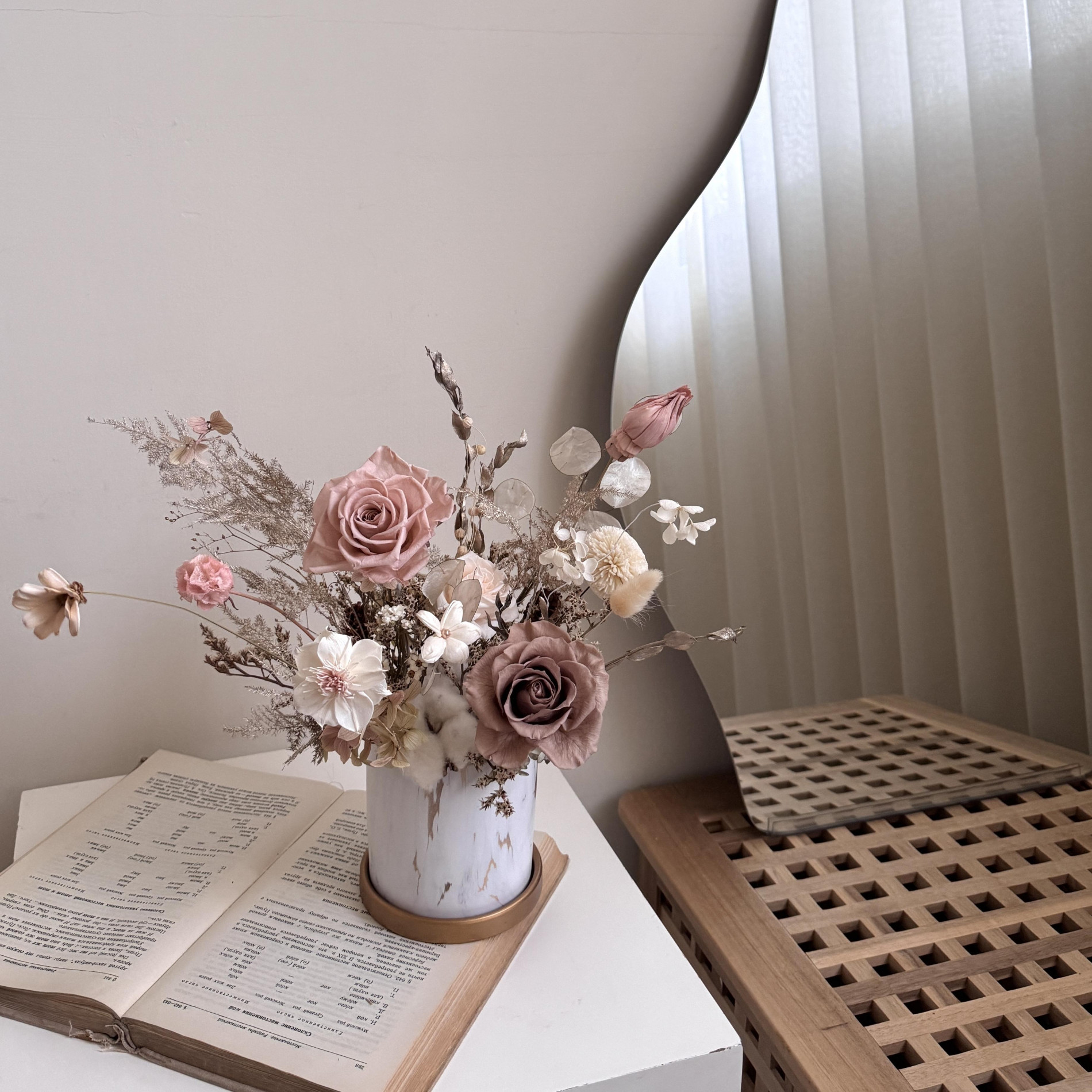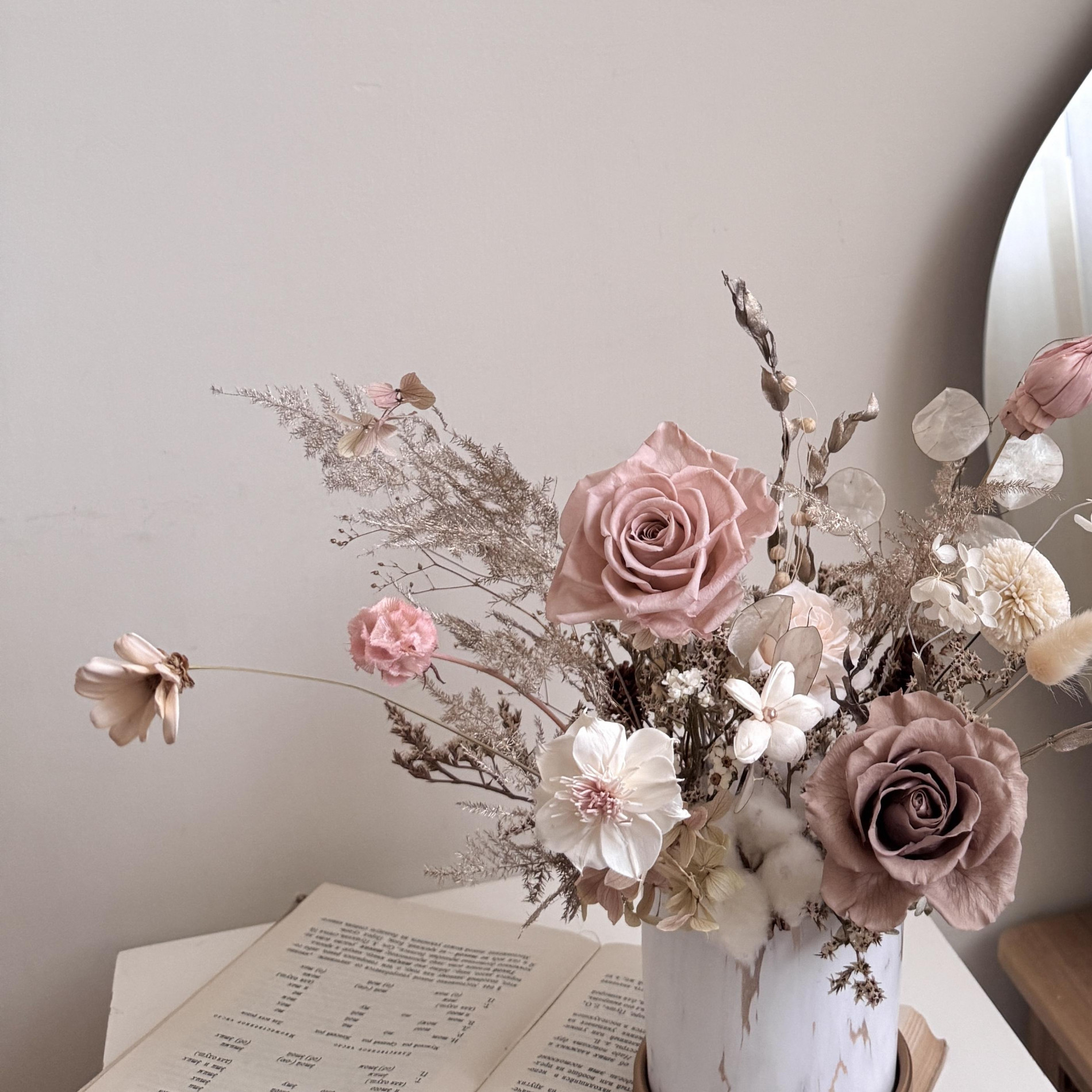 / 乾燥永生花材為鮮花製作而成,每批顏色大小姿態皆不相同,進貨不穩定且有季節性,如花材缺貨將用同色系的相似花材葉材更替,可接受再預訂