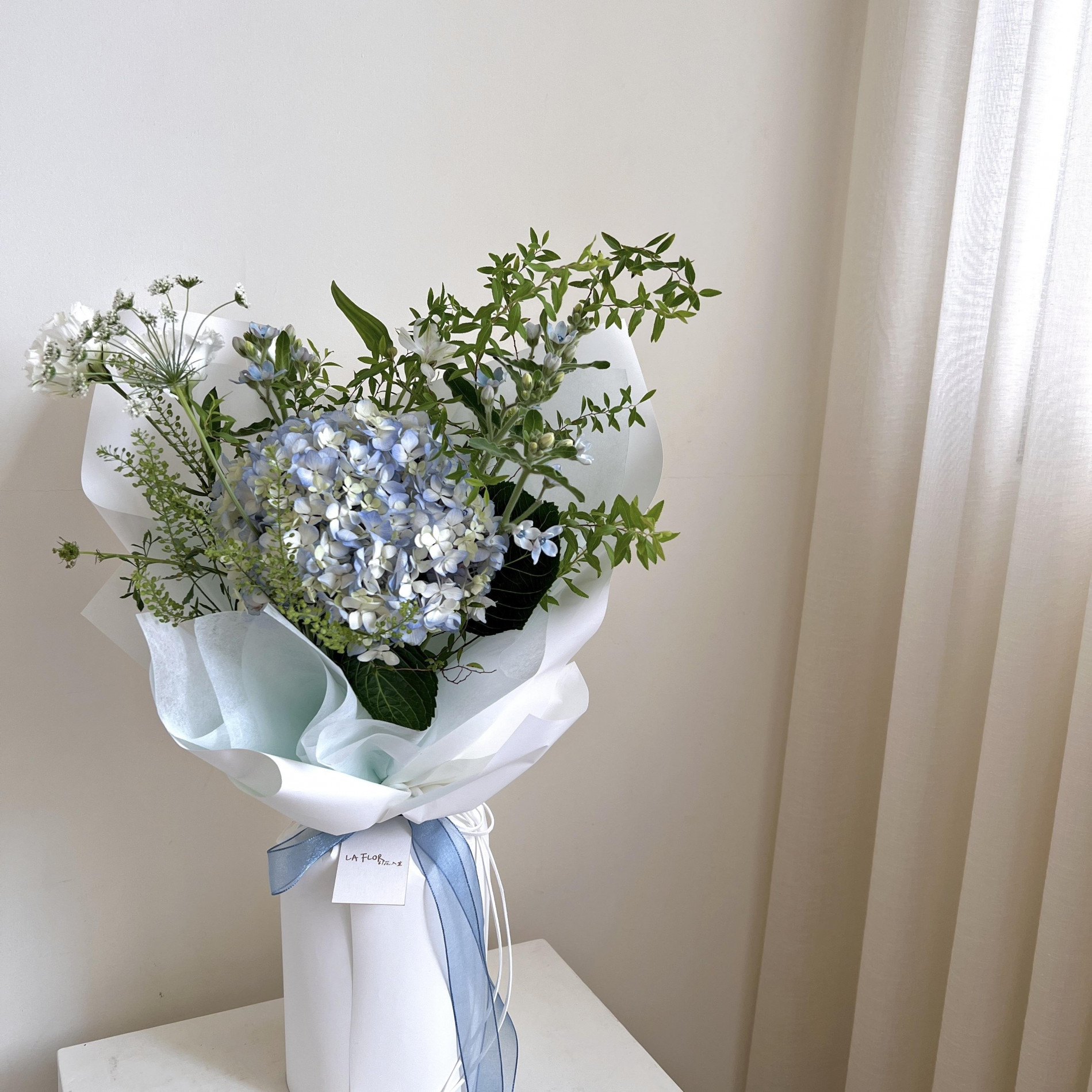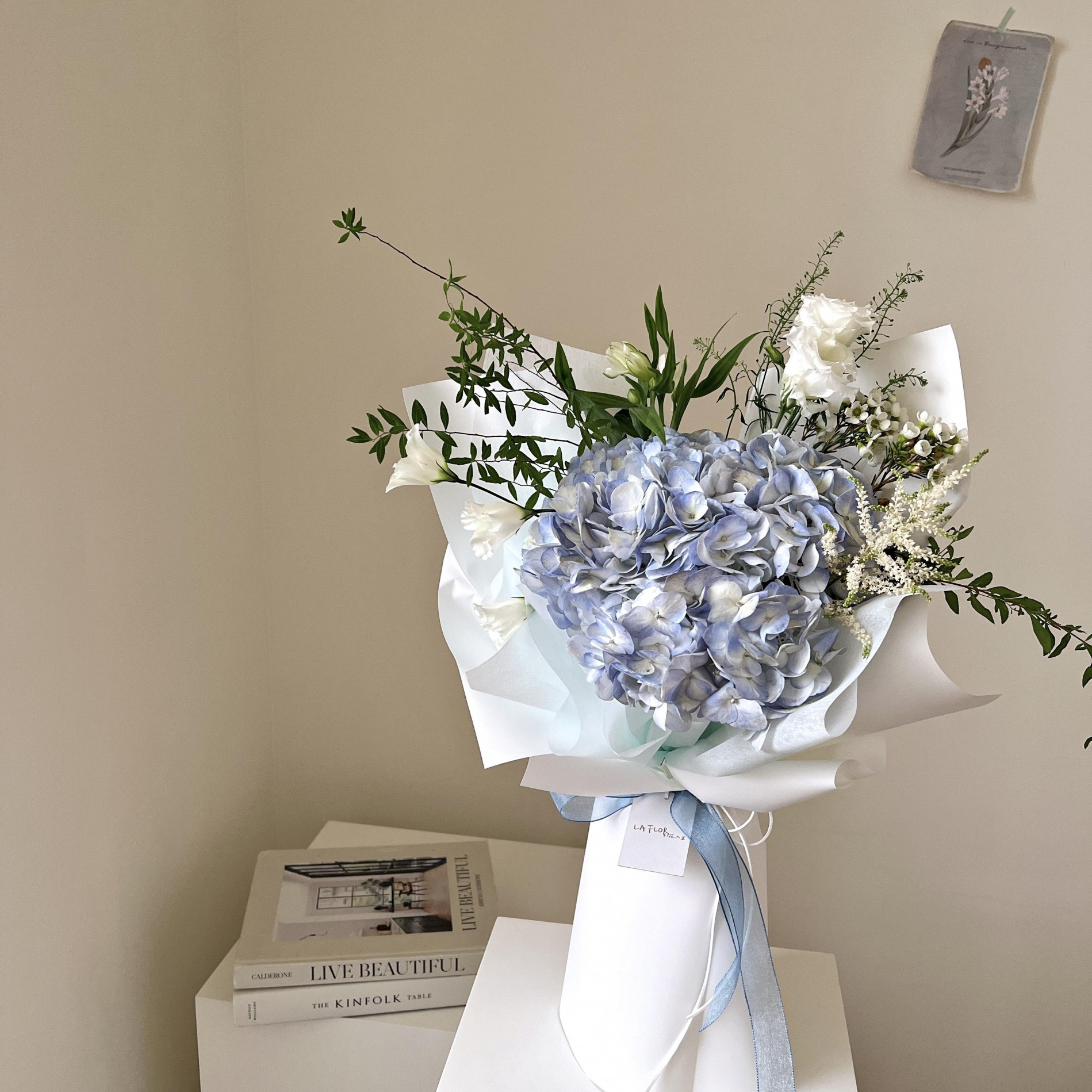 夏天最常被指定的藍色繡球花束,清爽的藍白配色,好適合夏天!