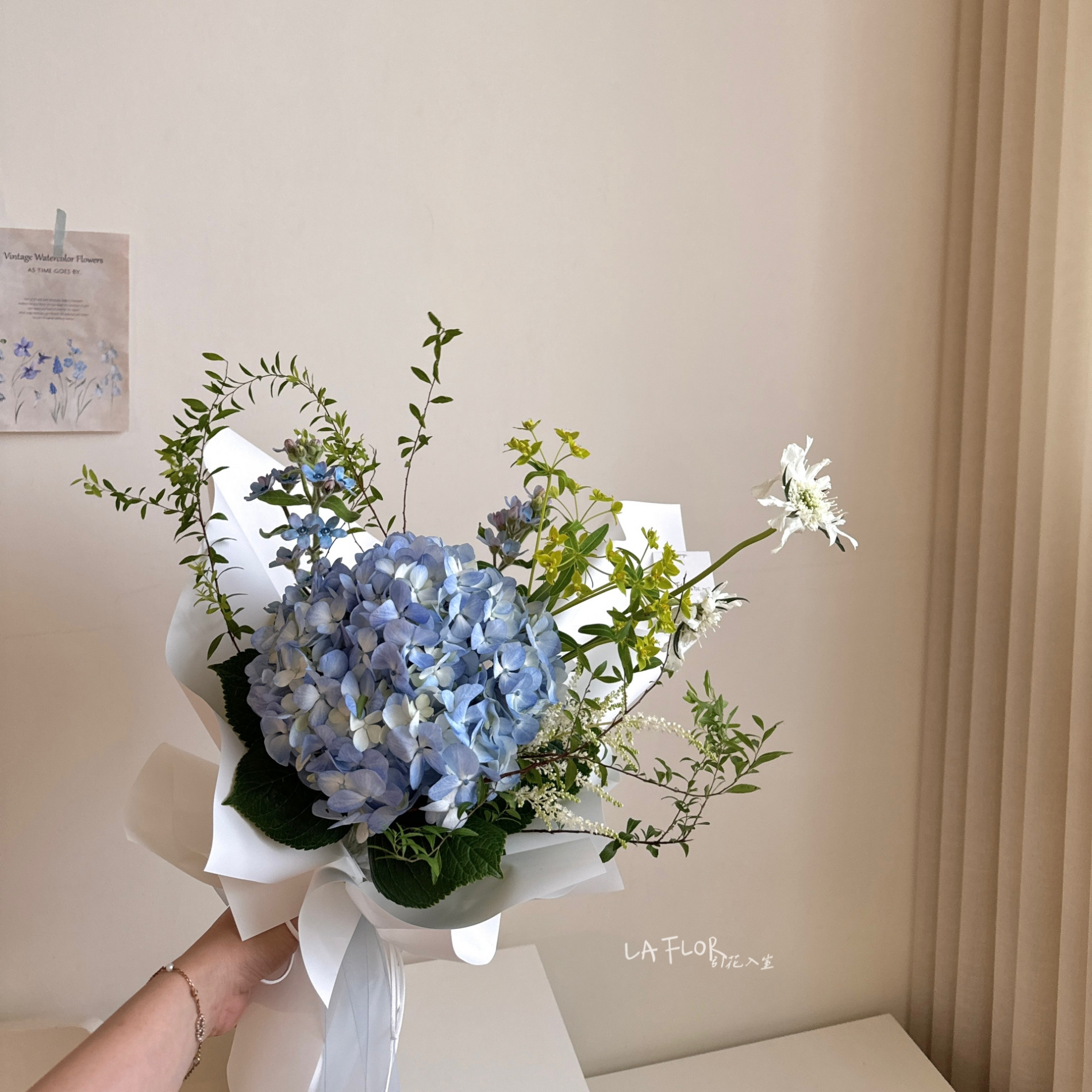 鮮花花材:藍色繡球花+藍白色系多樣季節花材