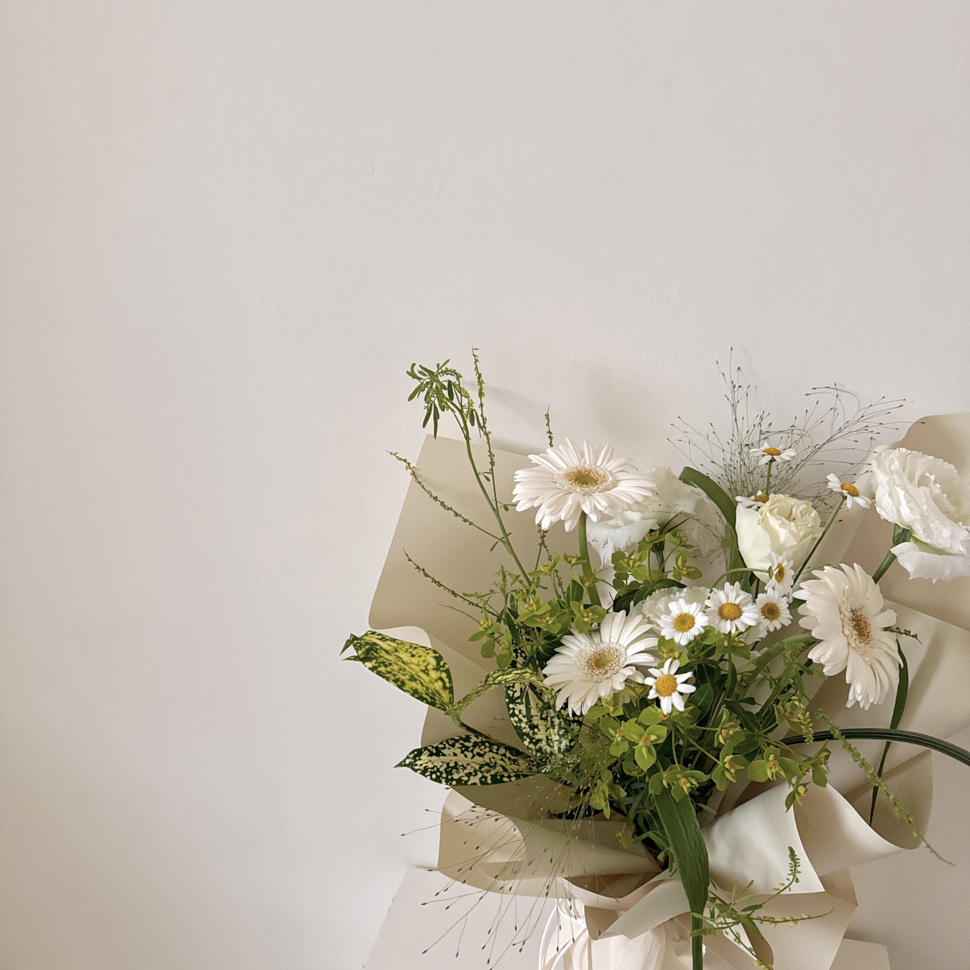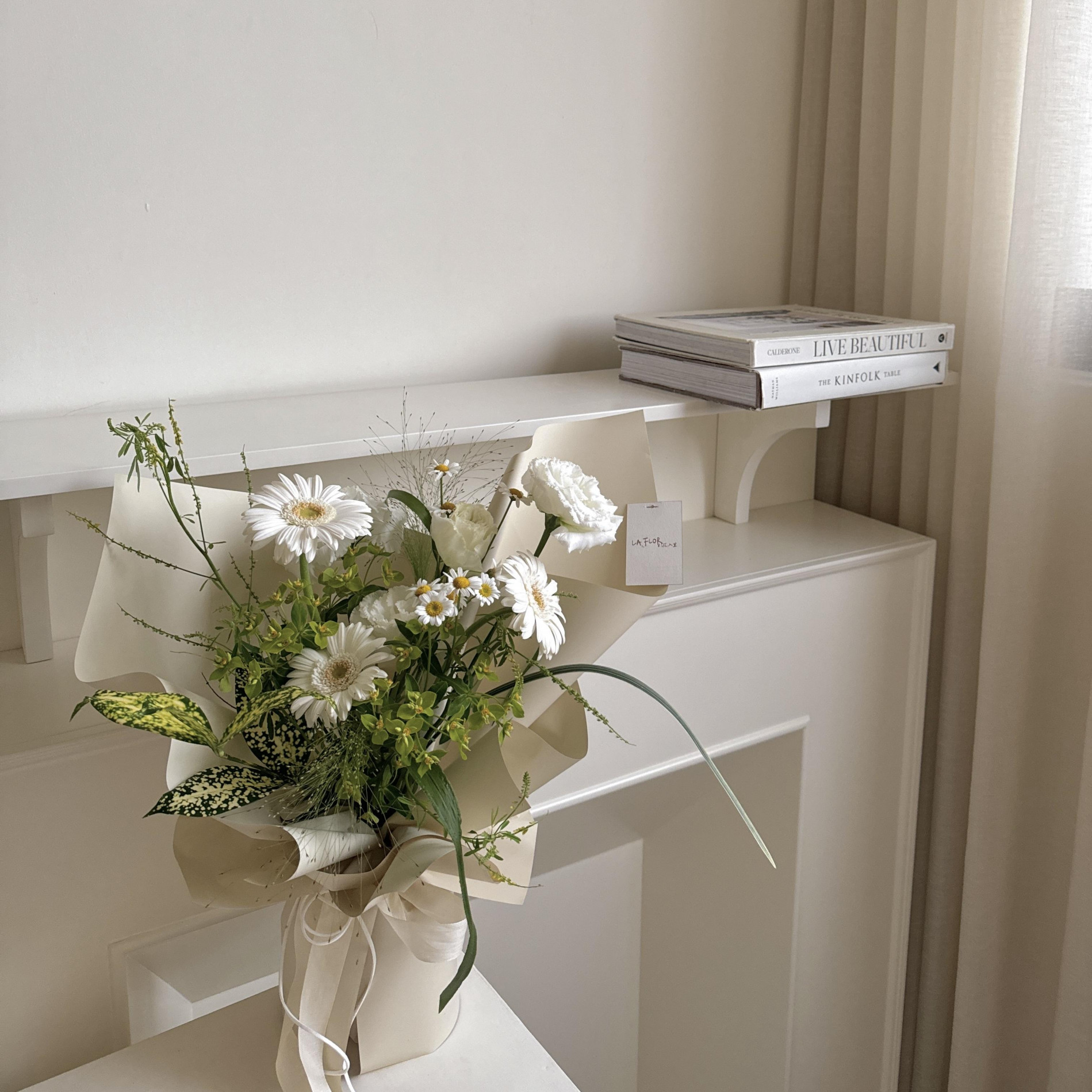 / 太陽花以外配花將挑選當季花材設計白綠色系,不會跟照片一模一樣,如白色太陽花缺貨將改用其他白色系花款替代,請相信LA FLOR的美感與設計