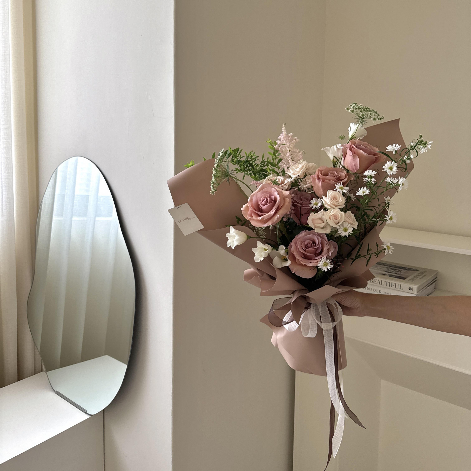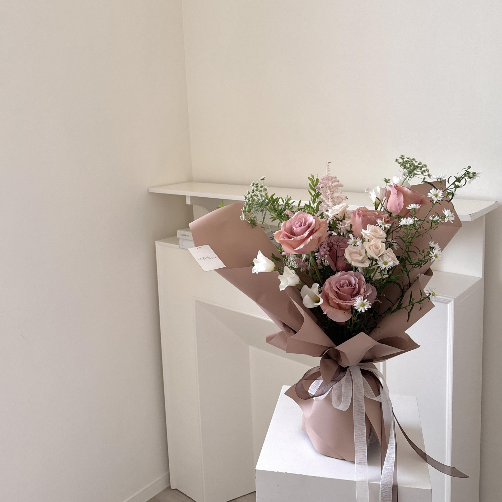 安靜午茶時光花束:進口摩卡玫瑰+粉白色系季節花材