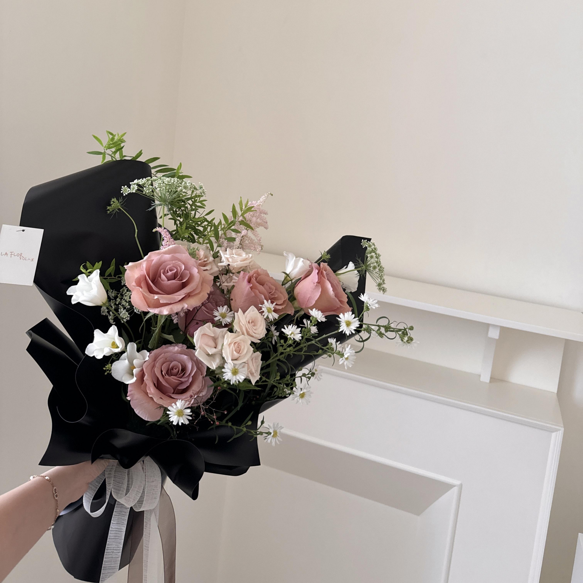 / 玫瑰以外配花將挑選當季花材設計大地粉色系,不會跟照片一模一樣,如玫瑰缺貨將改用其他同色系玫瑰替代,請相信LA FLOR的美感與設計