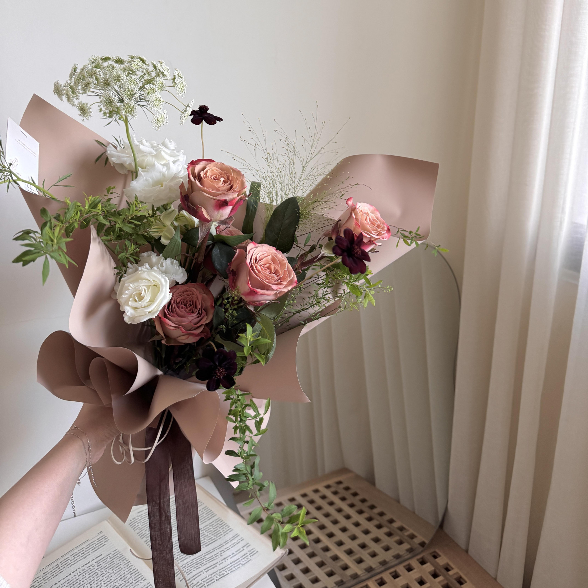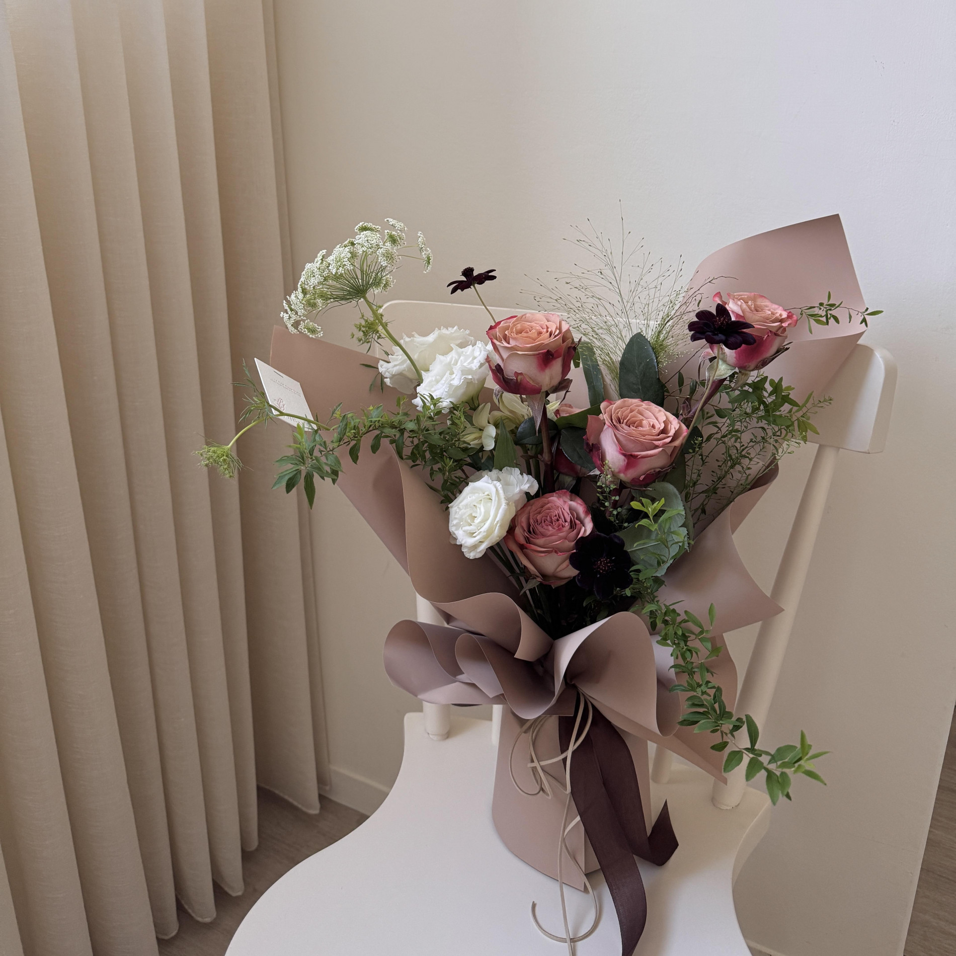 經典大地色系卡布奇諾玫瑰,搭配奶茶色包裝紙,氣質沈穩的一款質感花束.ᐟ.ᐟ.ᐟ