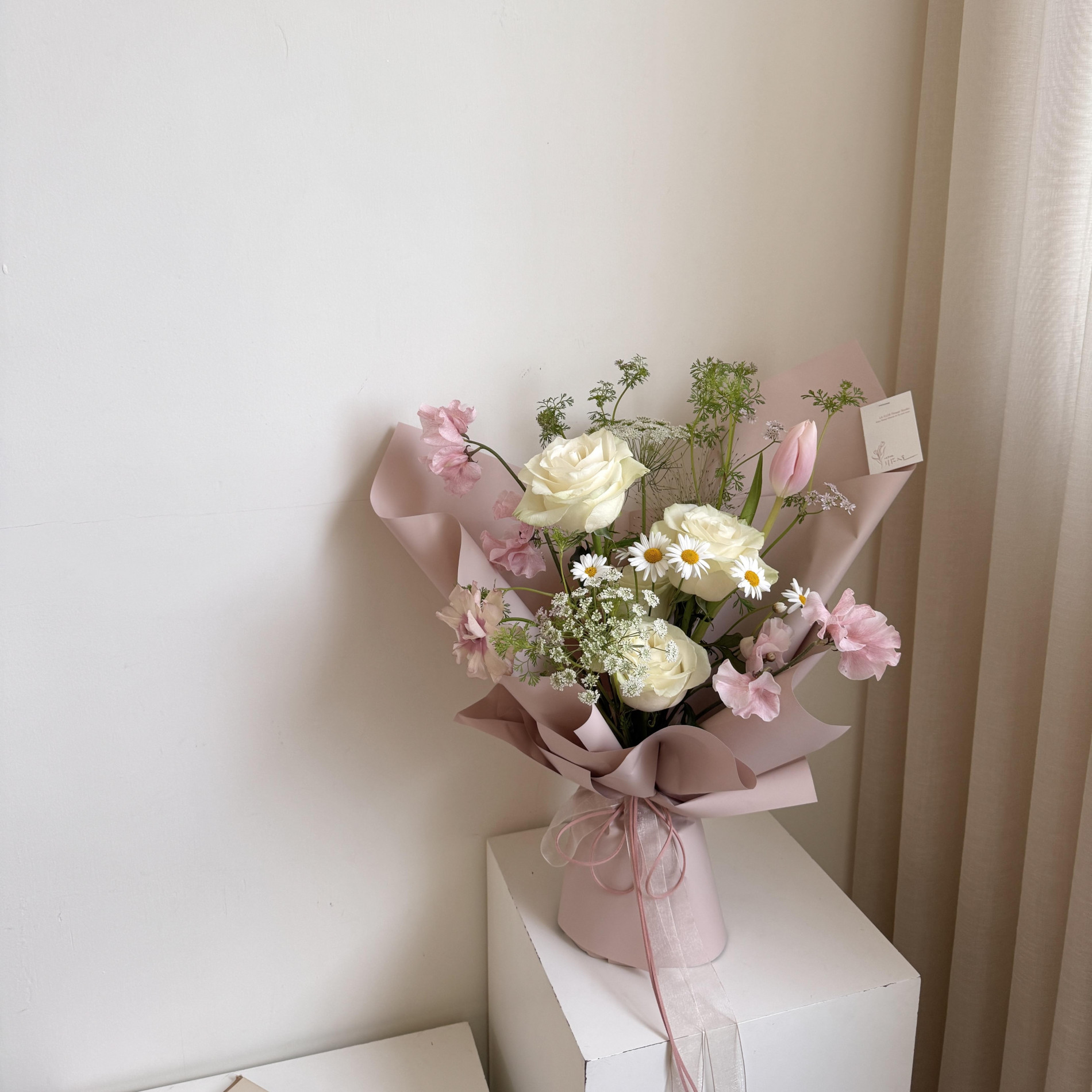 鮮花花材:白玫瑰4朵+白粉色季節花材