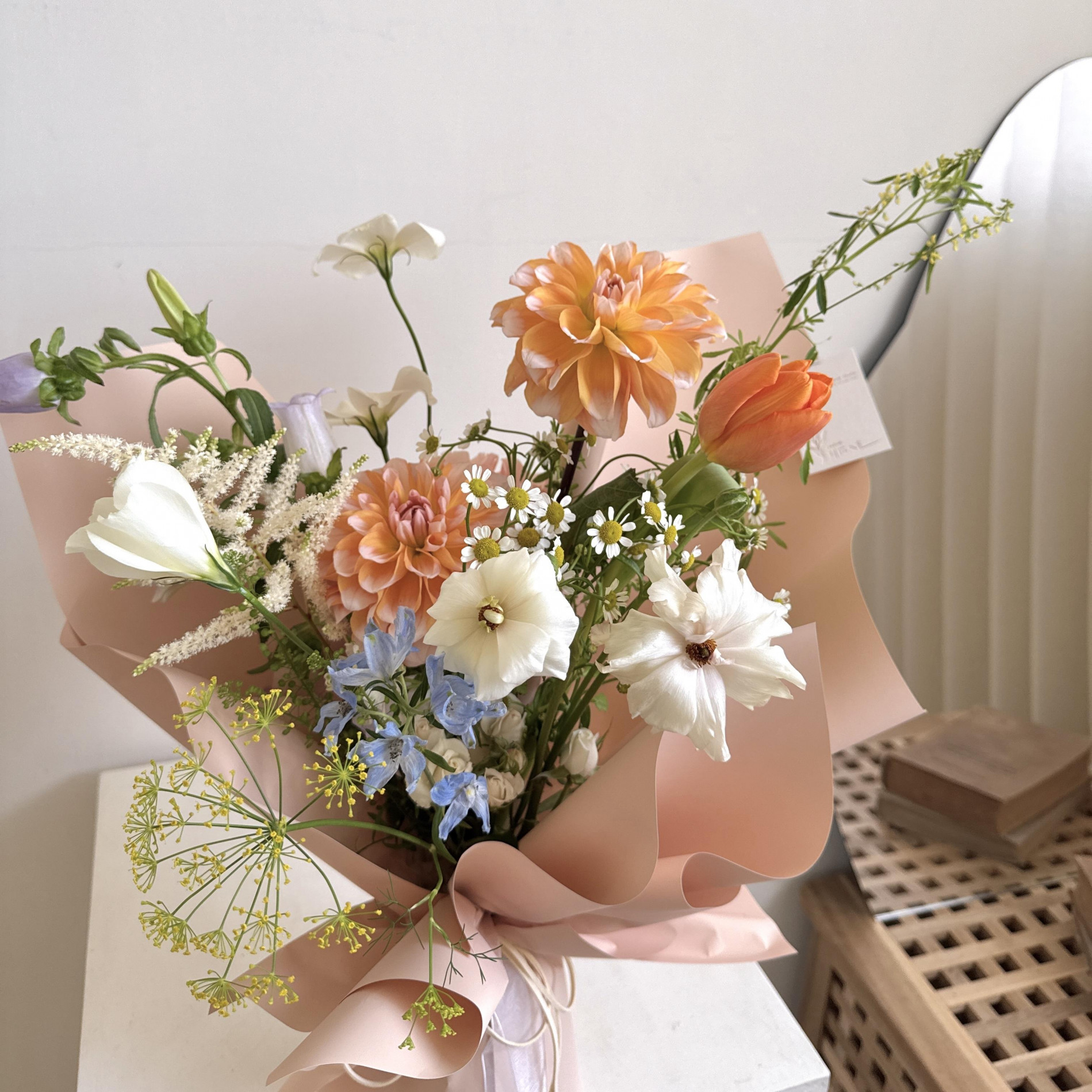 鮮花花材:大理花、鬱金香、風鈴桔梗...等季節花材