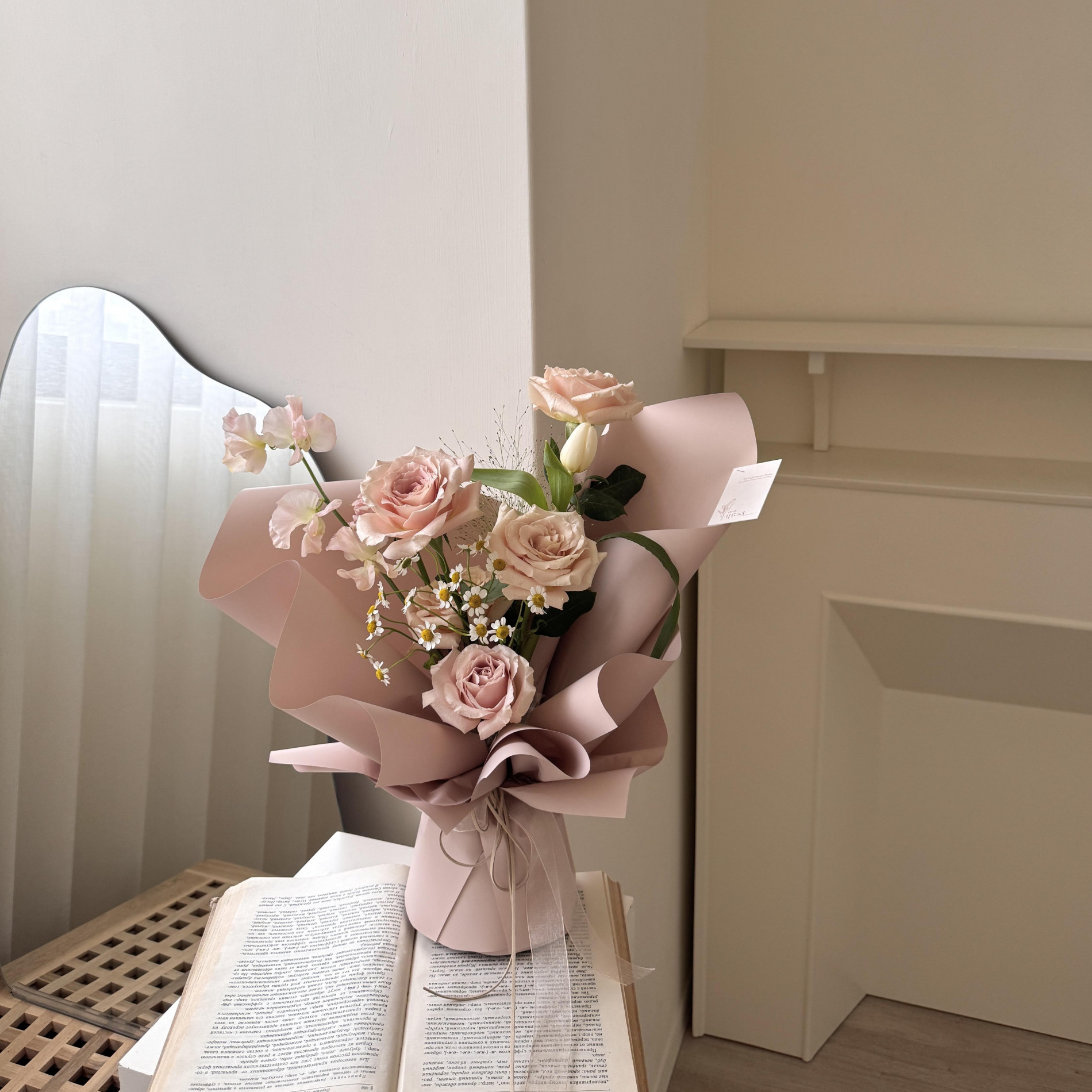 鮮花花材:進口流沙玫瑰6朵+鬱金香+3款季節配花