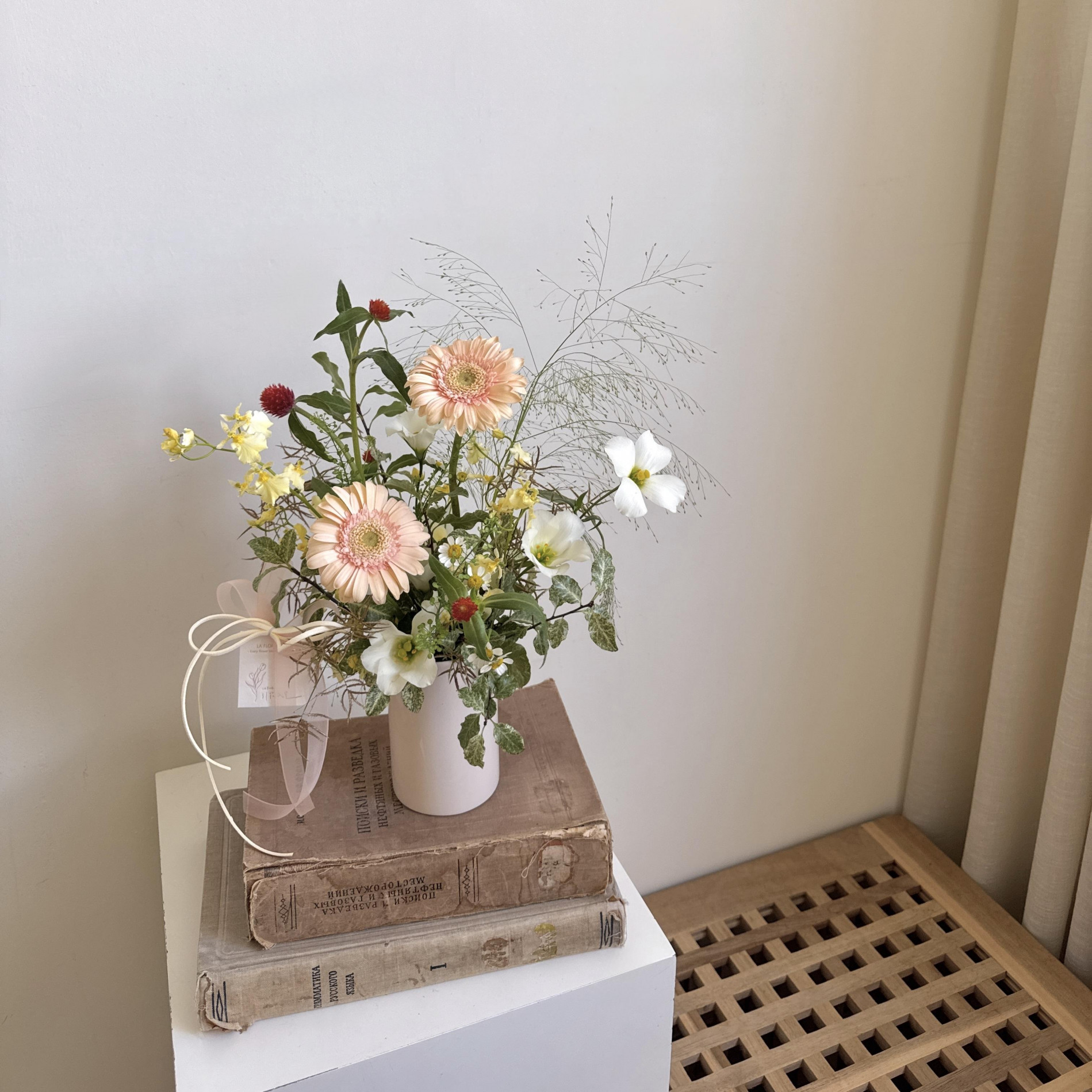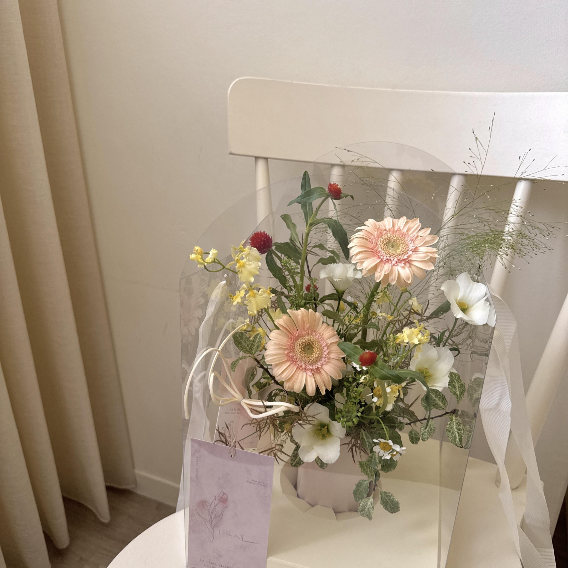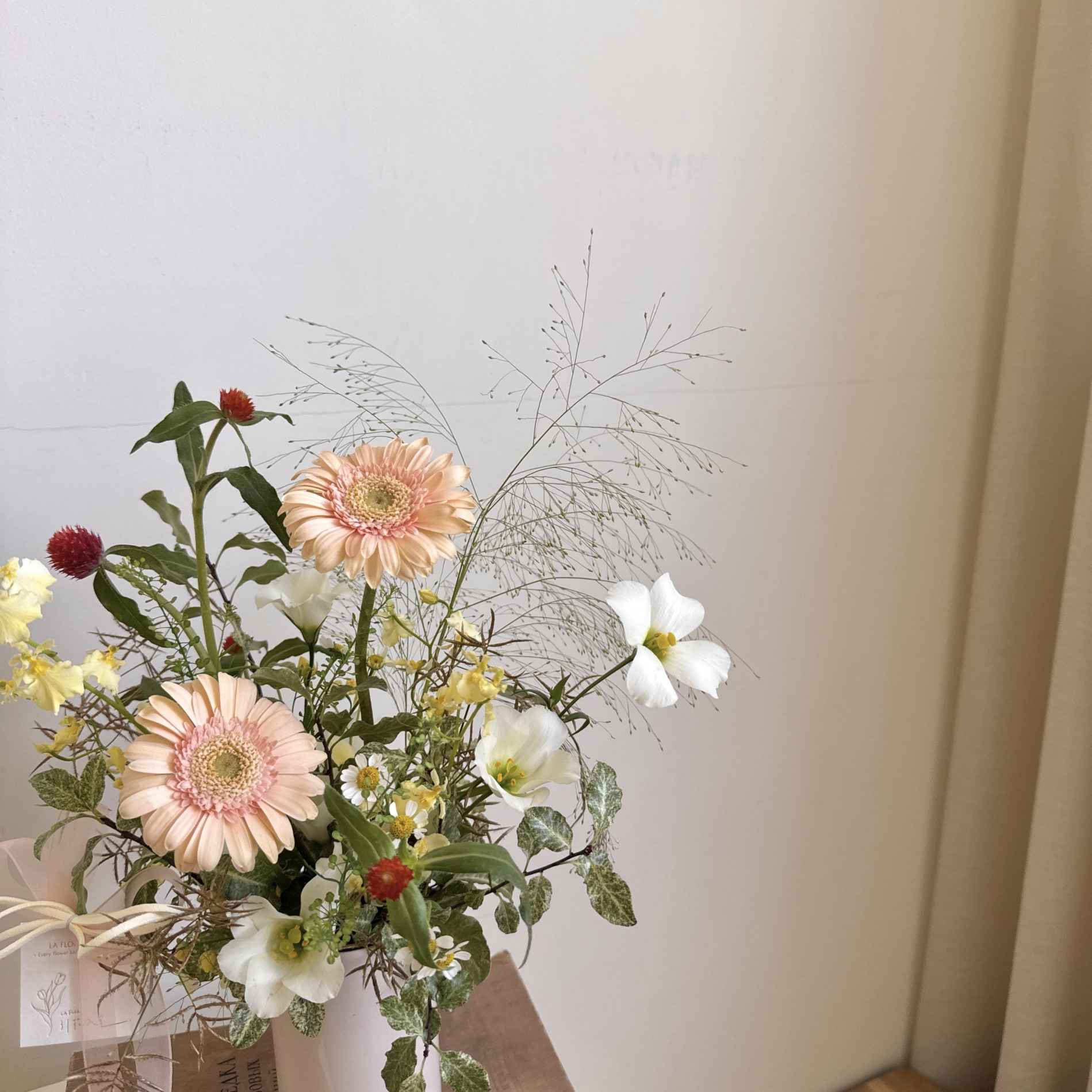鮮花花材:非洲菊+文心蘭+涼風桔梗...等季節花材