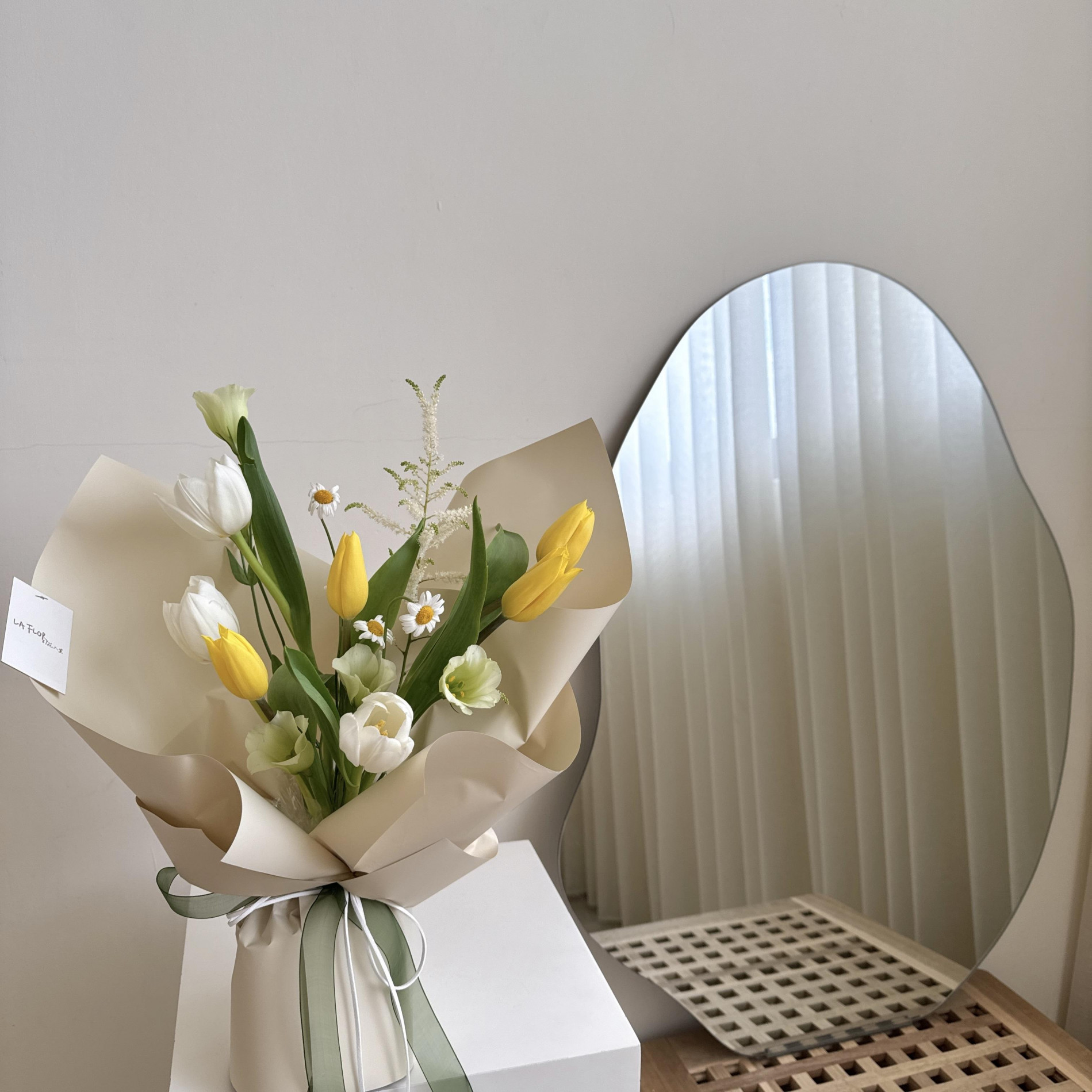鮮花花材:7朵白色+黃色鬱金香+3款季節配花
