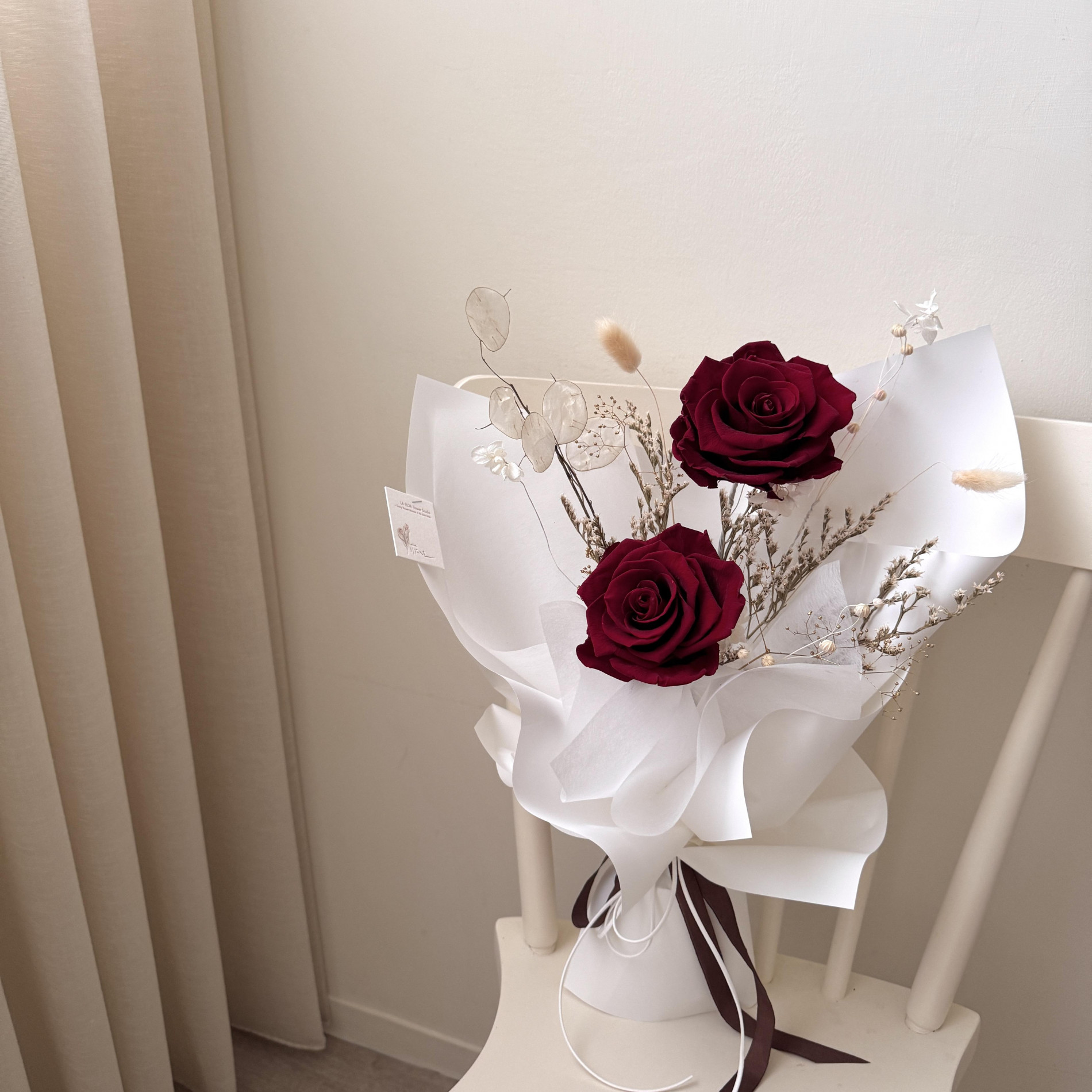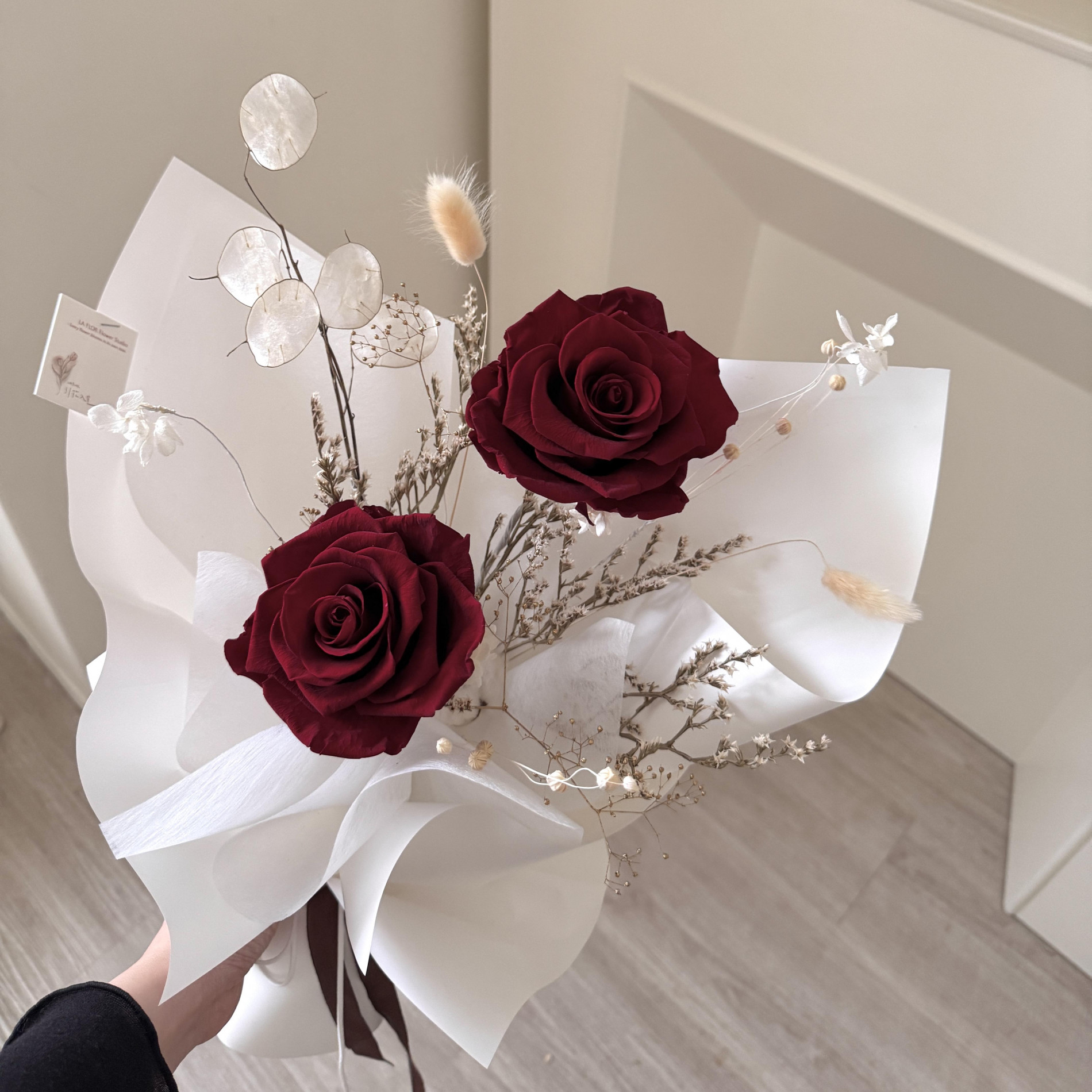 乾燥永生花材:2朵永生紅玫瑰+乾燥永生花材