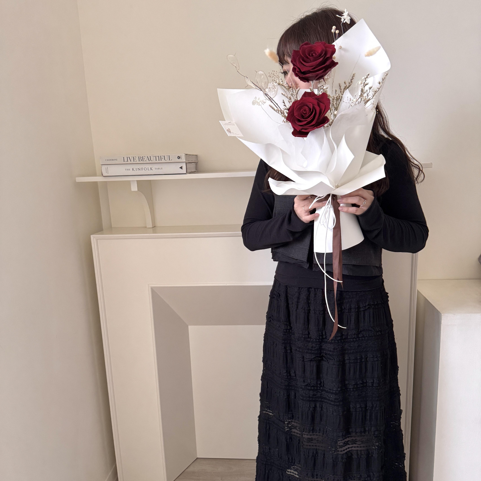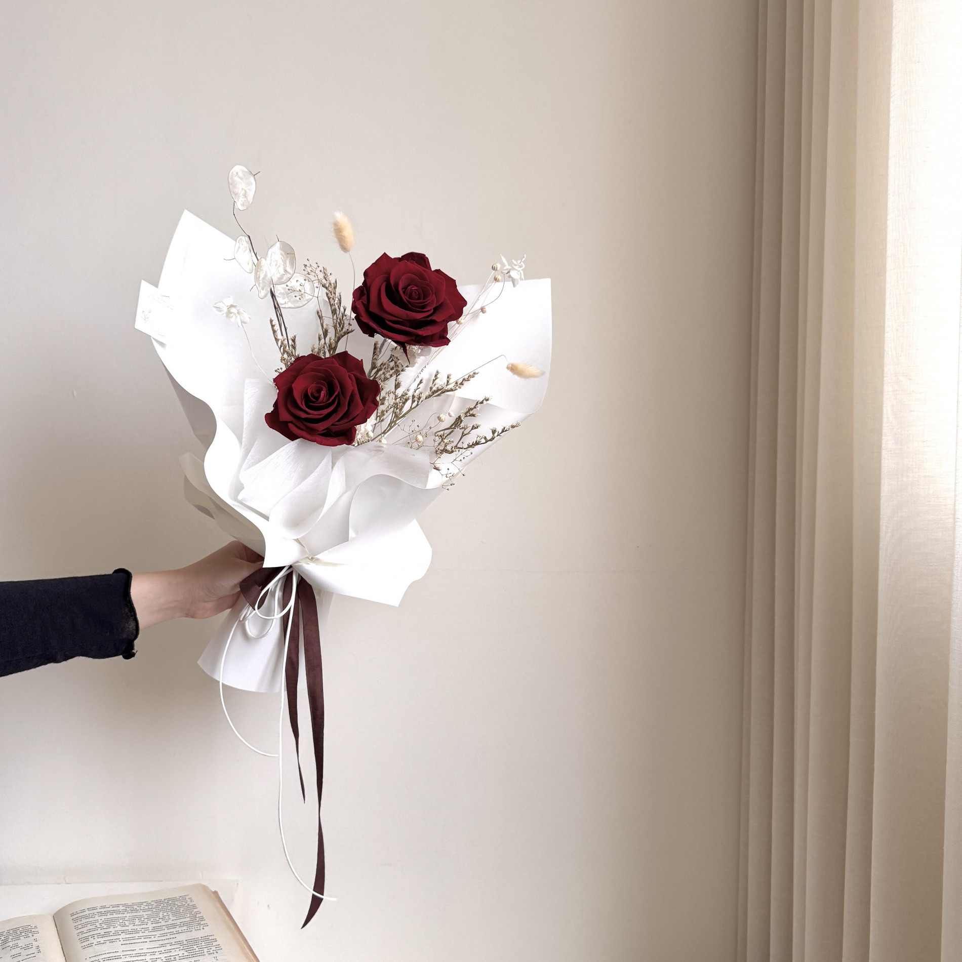 手提花束提袋時請留意勿壓到花朵,帶回家後無需拆開包裝紙,可直接擺放在家裡適合的角落欣賞。