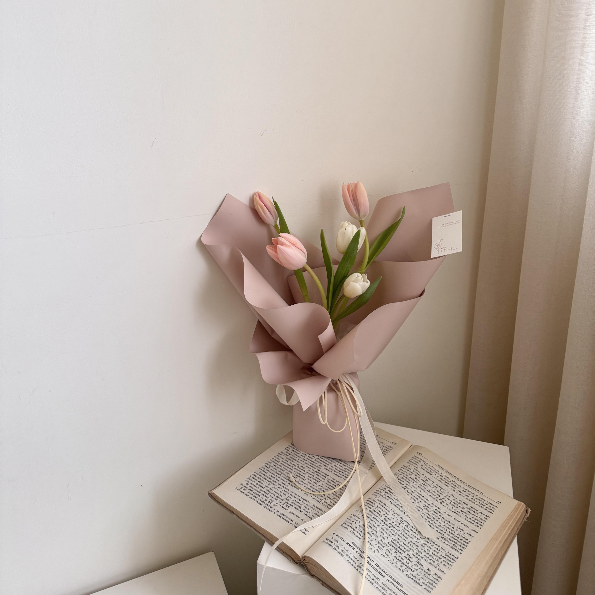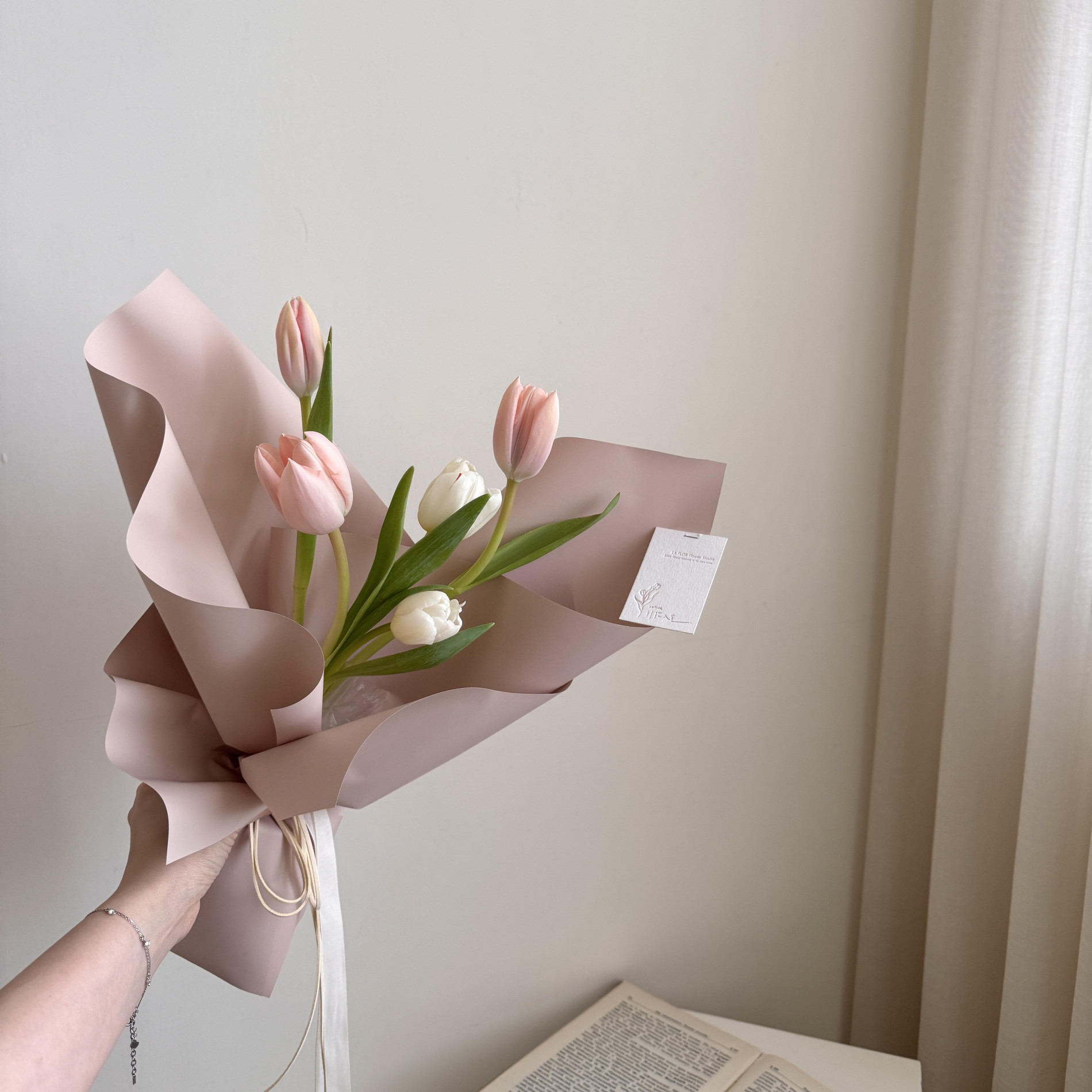 鮮花花材:5朵白+粉色鬱金香