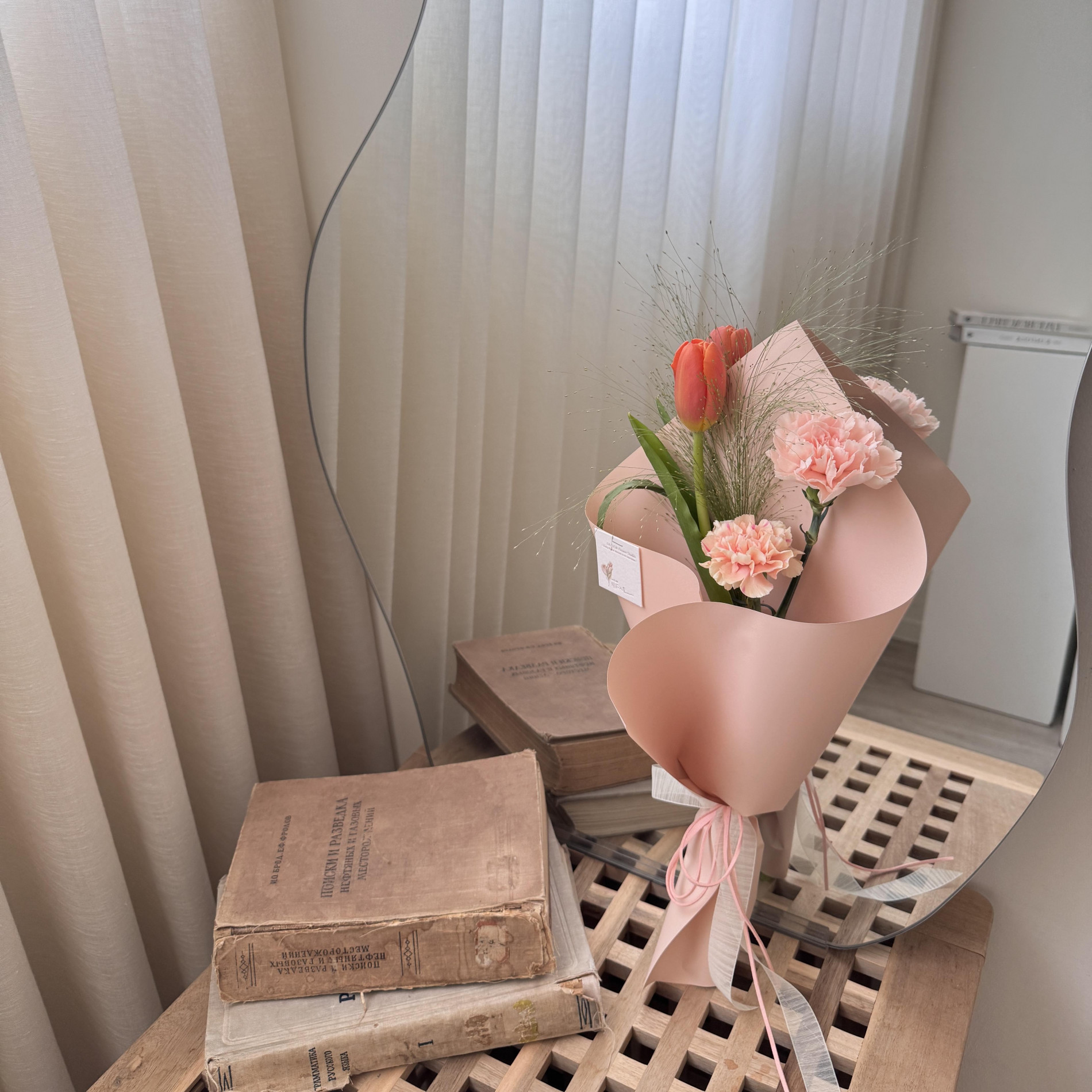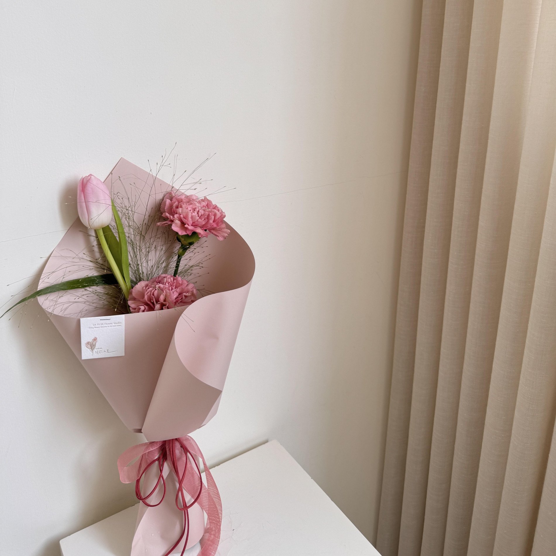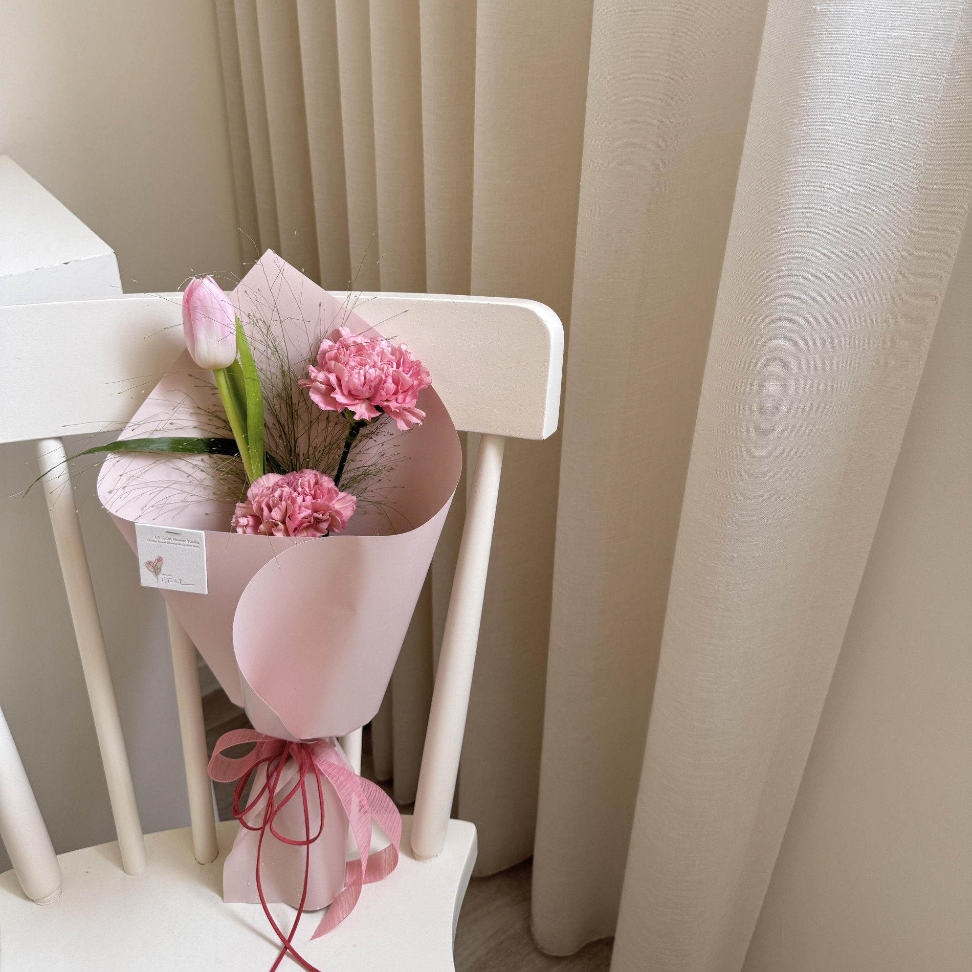 圖4-5 古典粉:粉色鬱金香+2朵康乃馨+一款季節葉材