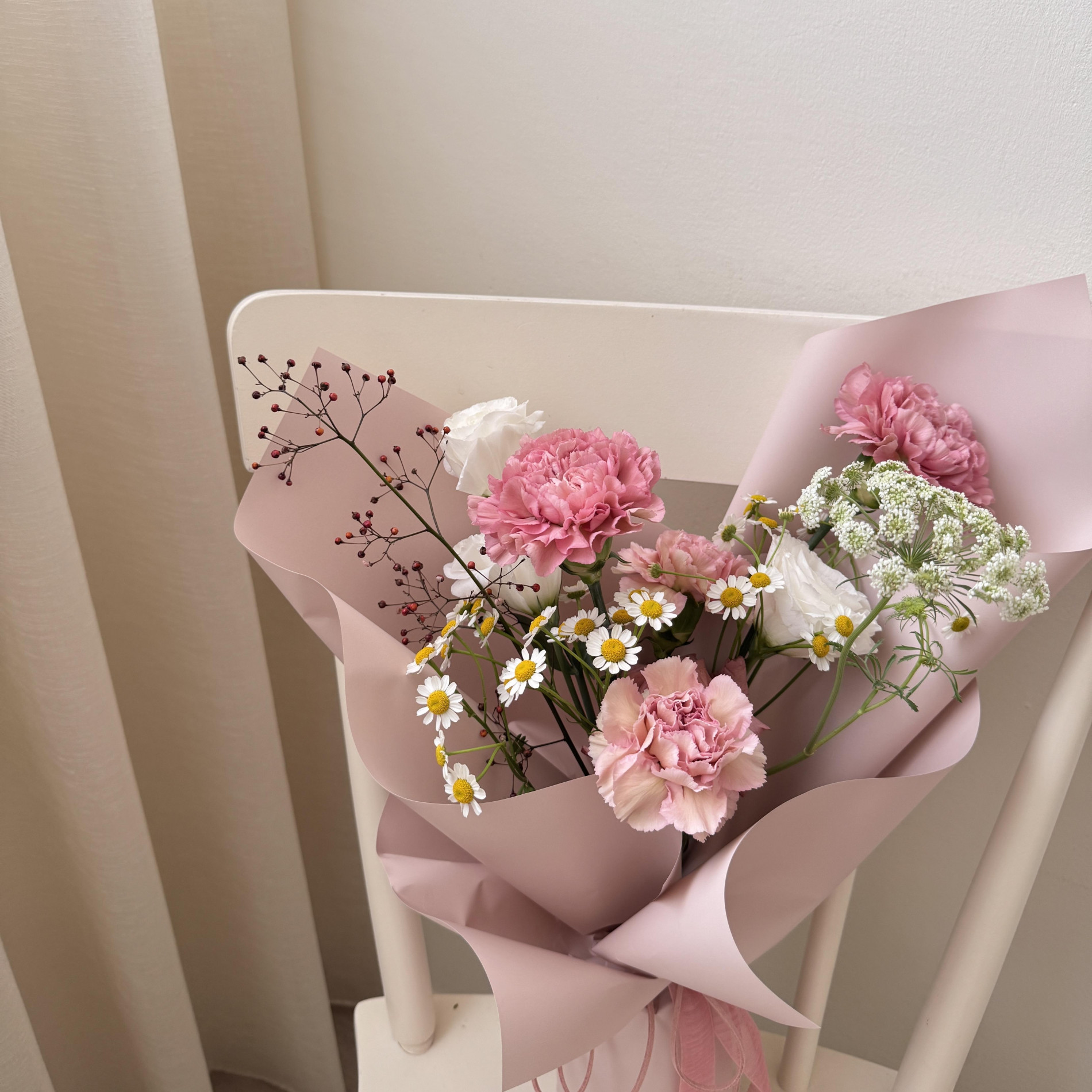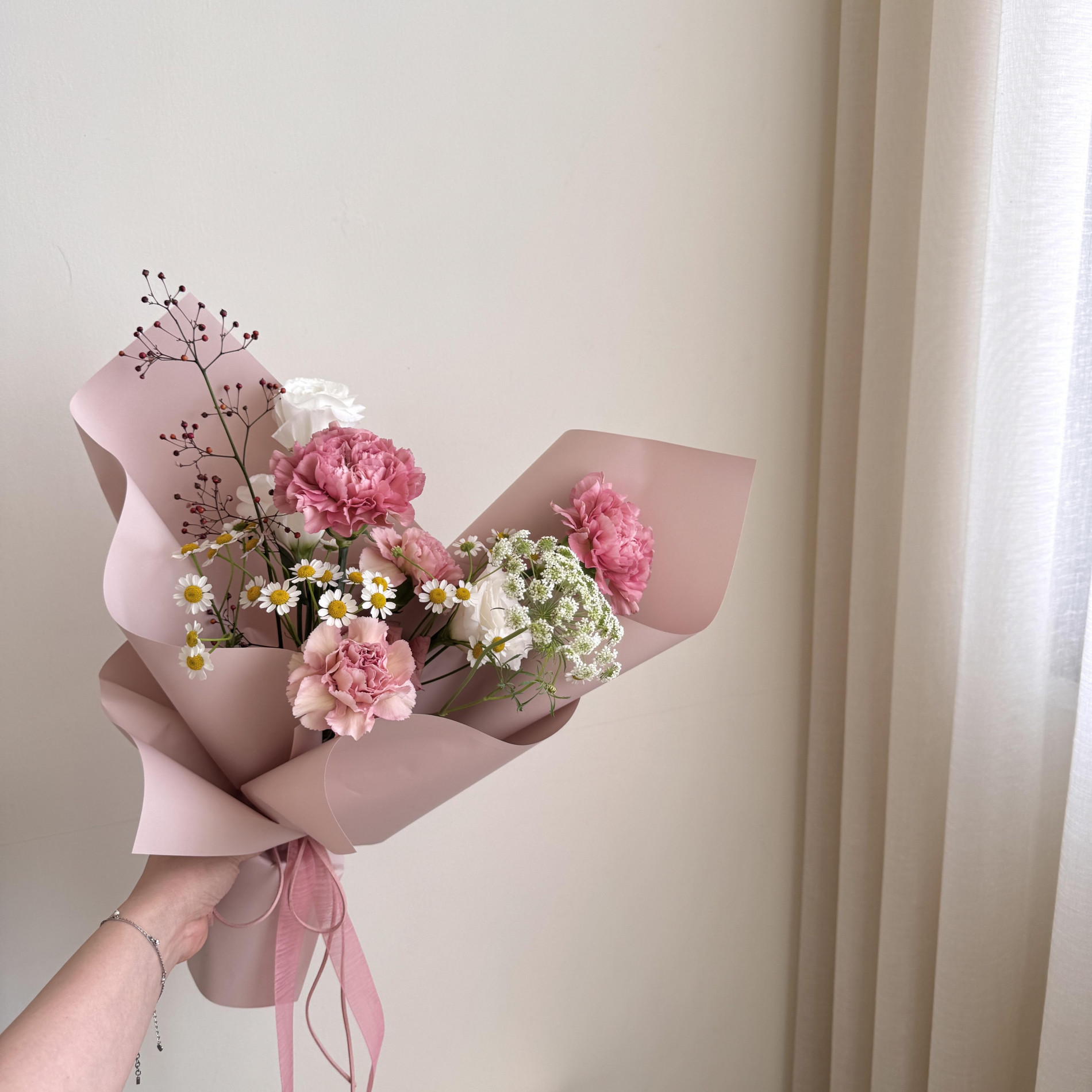 鮮花花材:4朵康乃馨(2色)+1朵玫瑰+4款季節花葉材