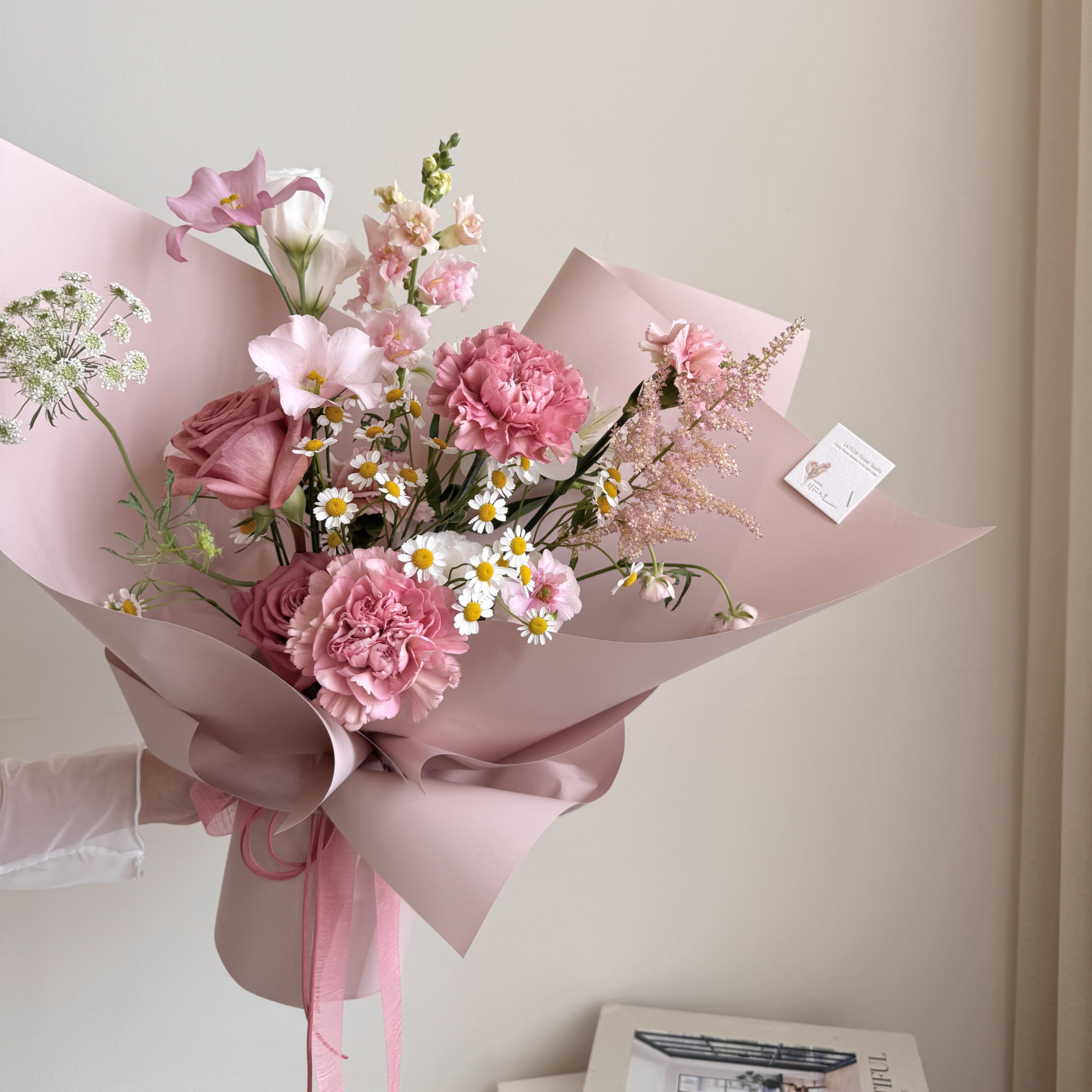 鮮花花材:兩色康乃馨+玫瑰+8款白粉色系季節花葉材